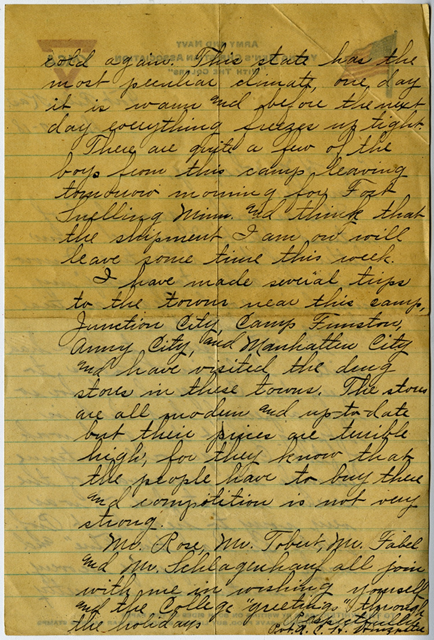 cold again. This state has the most peculiar climate, one day it is warm and before the next day everything freezes up tight. There are quite a few of the boys from this camp leaving tomorrow for Fort Snelling [Minnesota] and think that the shipment I am on will leave some time this week. I have made several trips to the towns near this camp, Junction City, Camp Funston, Army City, and Manhatten City and have visited the drug stores in these towns. The stores are all modern and up-to-date but their prices are terrible high, for they know that the people have to buy there and competition is not very strong. Mr. Rose, Mr. Tobert, Mr. Fabel and Mr. Schlagenhauf all join with me in wishing yourself and the College “greetings” through the holidays Respectfully Pvt. A.C.H. Hinzpeter