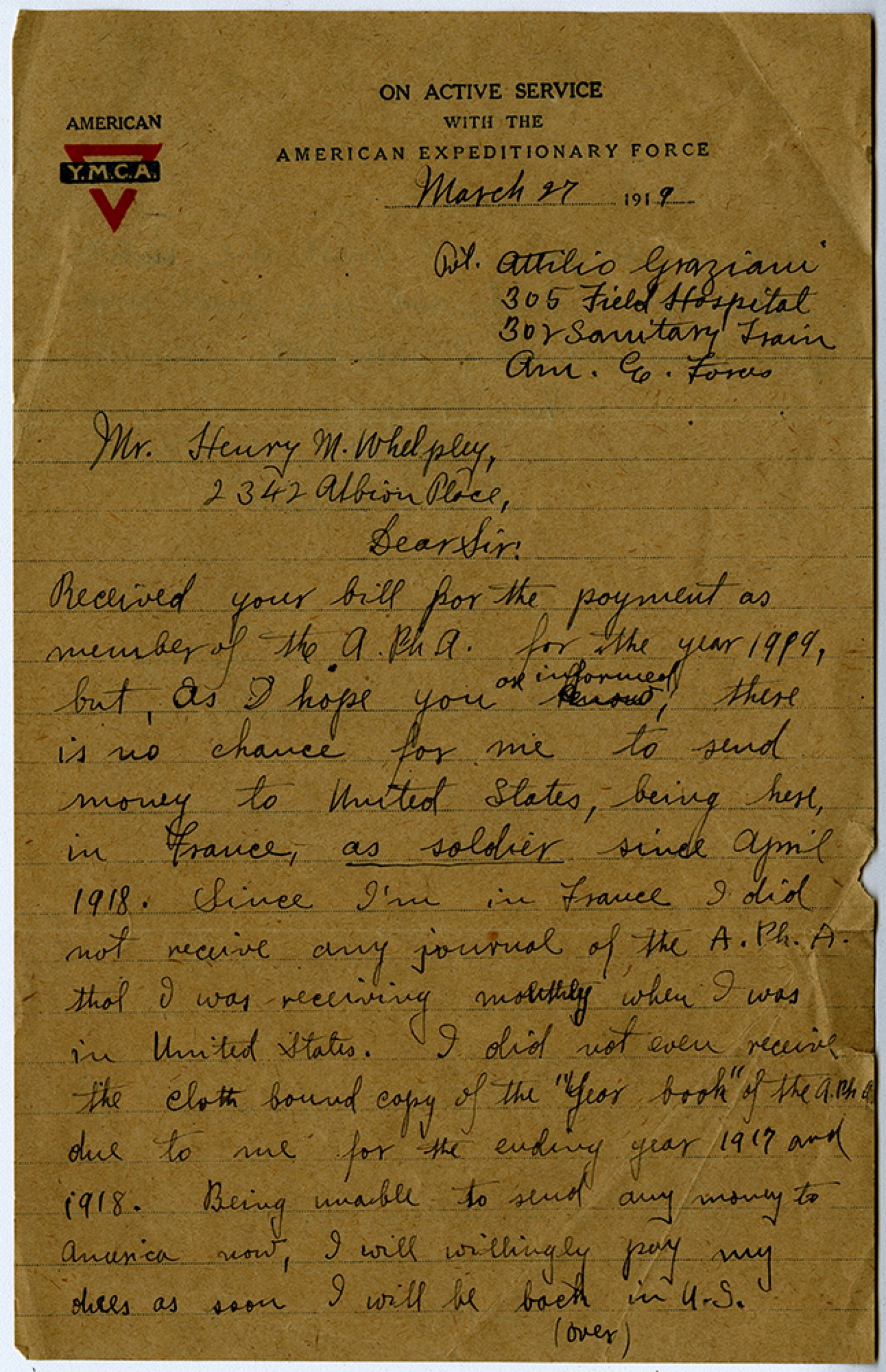 March 27 [1919] Pvt. Attilio Graziani 305 Field Hospital 302 Sanitary Train [American Expeditionary] Forces Mr. Henry [Milton] Whelpley, 2342 Albion Place, Dear Sir: Received your bill for the payment as member of the A.Ph.A. for the year 1919, but, as I hope you or informed, there is no chance for me to send money to United States, being here, in France, as soldier since April 1918. Since I’m in France I did not receive any journal of the A.Ph.A. that I was receiving monthly when I was in the United States. I did not even receive the cloth bound copy of the “Year book” of the A.Ph.A. due to me for the ending year 1917 and 1918. Being unable to send any money to America now, I will willingly pay my dues as soon I will be back in U.S. (over)