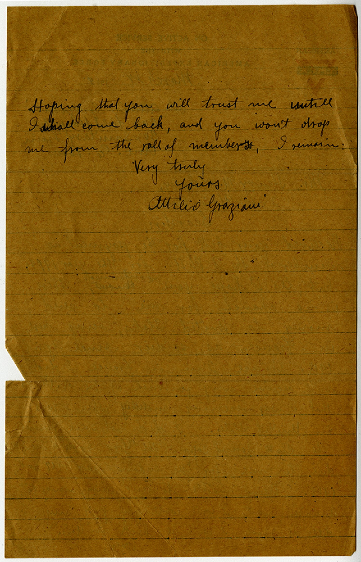 Hoping that you will trust me untill I shall come back, and you won’t drop me from the roll of members, I remain: very truly yours Attilio Graziani