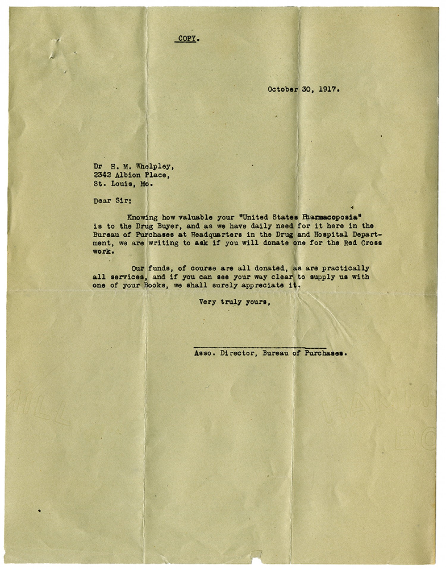 COPY. October 30, 1917. Dr. [Henry Milton] Whelpey, 2342 Albion Place, St. Louis, [Missouri] Dear Sir: Knowing how valuable your “United States [Pharmacopeia]’ is to the Drug Buyer, and as we have daily need for it here in the Bureau of Purchases at Headquarters in the Drug and Hospital Department, we are writing to ask if you will donate one for the Red Cross work. Our funds, of course are all donated, as are practically all services, and if you can see your way clear to supply us with one of your Books, we shall surely appreciate it. Very truly yours, Asso. Director, Bureau of Purchases.