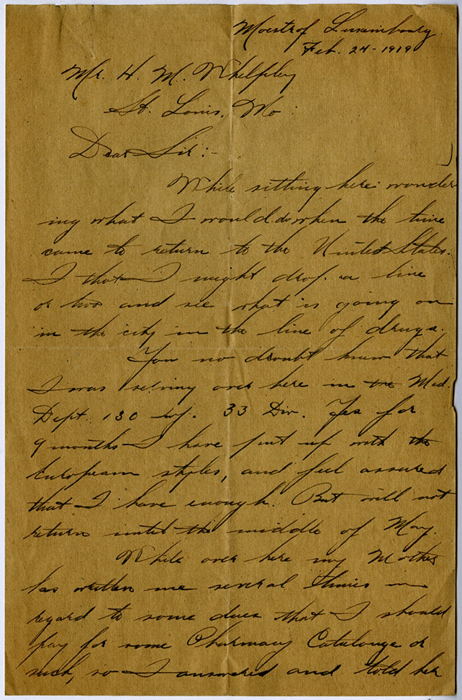 Moestr of Luxembourg [February] 24, 1919 Mr. [Henry Milton] Whelpley St. Louis, [Missouri] Dear Sir:- While sitting here wondering what I would do when the time came to return to the United States. I thot I might drop a line or two and see what is going on in the city in the line of drugs. You no doubt know that I was serving over here in the Med. Dept 130 Inf. 33 Div. Yes for 9 months I have put up with the European styles, and feel assured that I have enough. But will not return until the middle of May. While over here my Mother has written me several times in regard to some dues that I should pay for some Pharmacy Catalouge or such, so I answered and told her