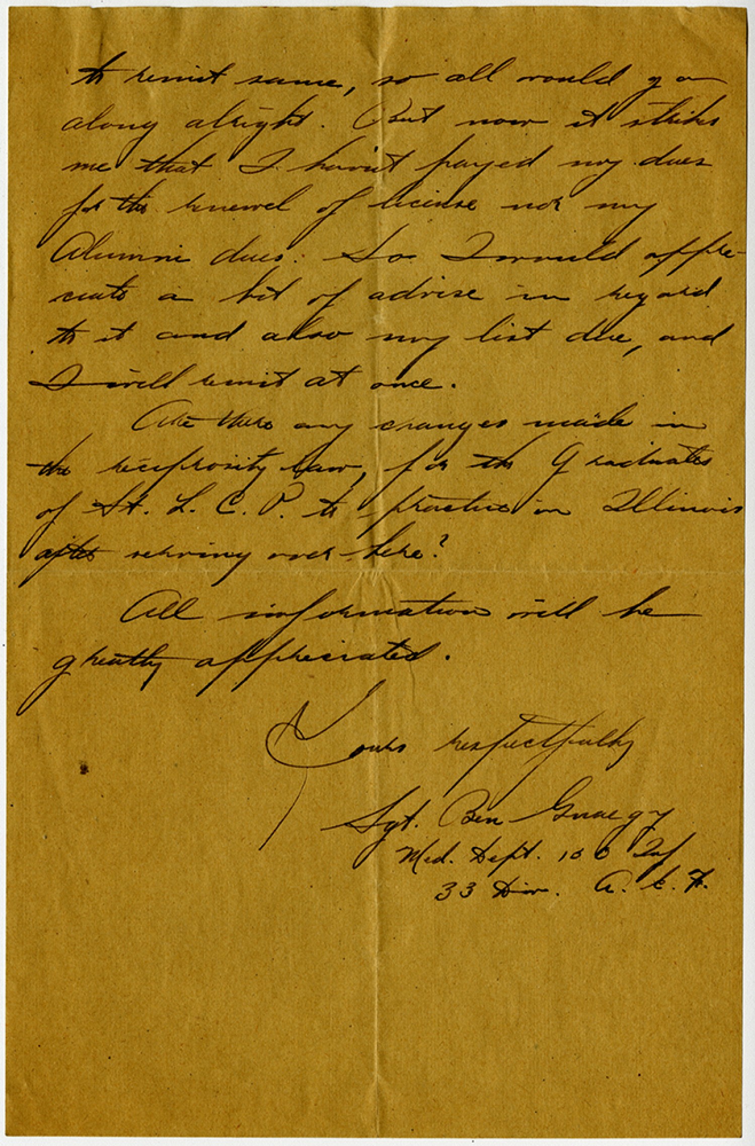 to remit same, so all would go along alright. But now it strikes me that I haven’t payed my dues for the renewal of license nor my Alumni dues. So I would appreciate a bit of advise in regard to it and also my list due, and I will remit at once. Are there any changes made in the reciprosity law, for the graduates of the [Saint Louis College of Pharmacy] to practice in Illinois after returning over here? All information will be greatly appreciated. Yours respectfully Sgt. Ben Guaegy Med. Dept. 130 Inf. 33 Div. A.E.F.