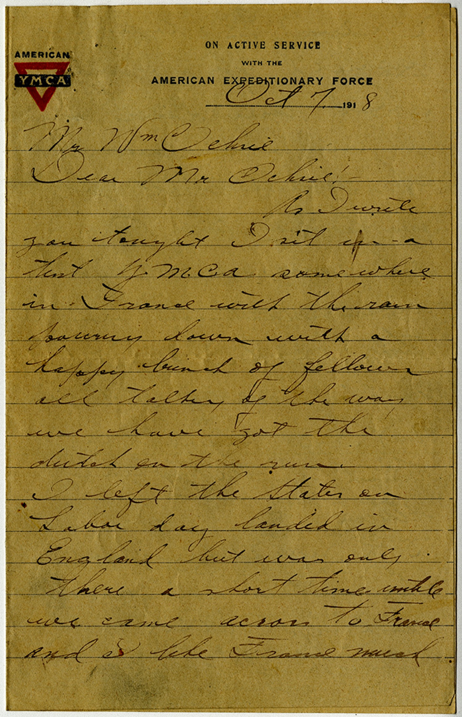 [October] 7, 1918 Mr. [William] Ochse Dear Mr Ochsie:- As I write you tonight I sit in a tent Y.M.C.A. somewhere in France with the rain pouring down with a happy bunch of fellows all talking of the way we have got the dutch on the run. I left the States on Labor day landed in England but was only there a short time while we came across to France and I like France much