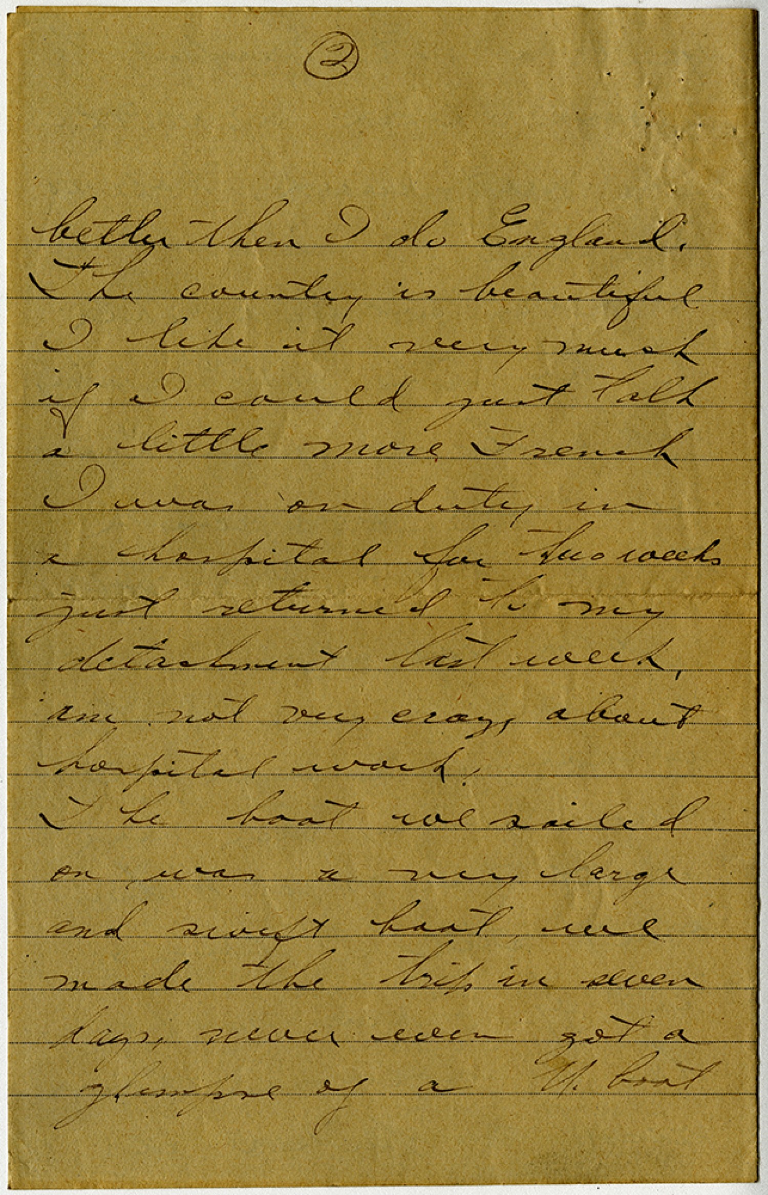 [page 2] better than I do England. The country is beautiful I like it very much if I could just talk a little more French I was on duty in a hospital for two weeks just returned to my detachment last week. Am not very crazy about hospital work. The boat we sailed on was a very large and swift boat we made the trip in seven days, never even got a glimpse of a U. boat