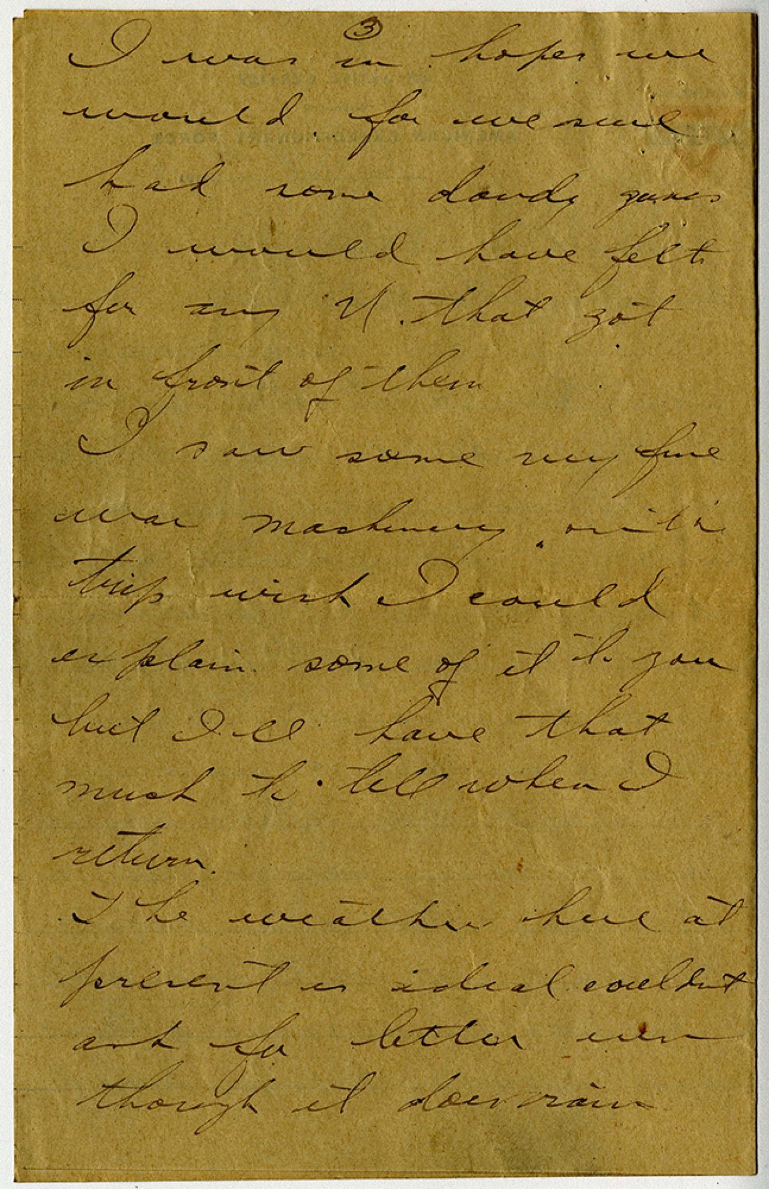[page 3] I was in hopes we would for we sure had some dandy guns I would have felt for my U. that got in front of them I saw some very fine war machinery on the trip wish I could explain some of it to you but Ill have that much to tell you when I return. The weather here at present is ideal couldnt ask for better even though it does rain