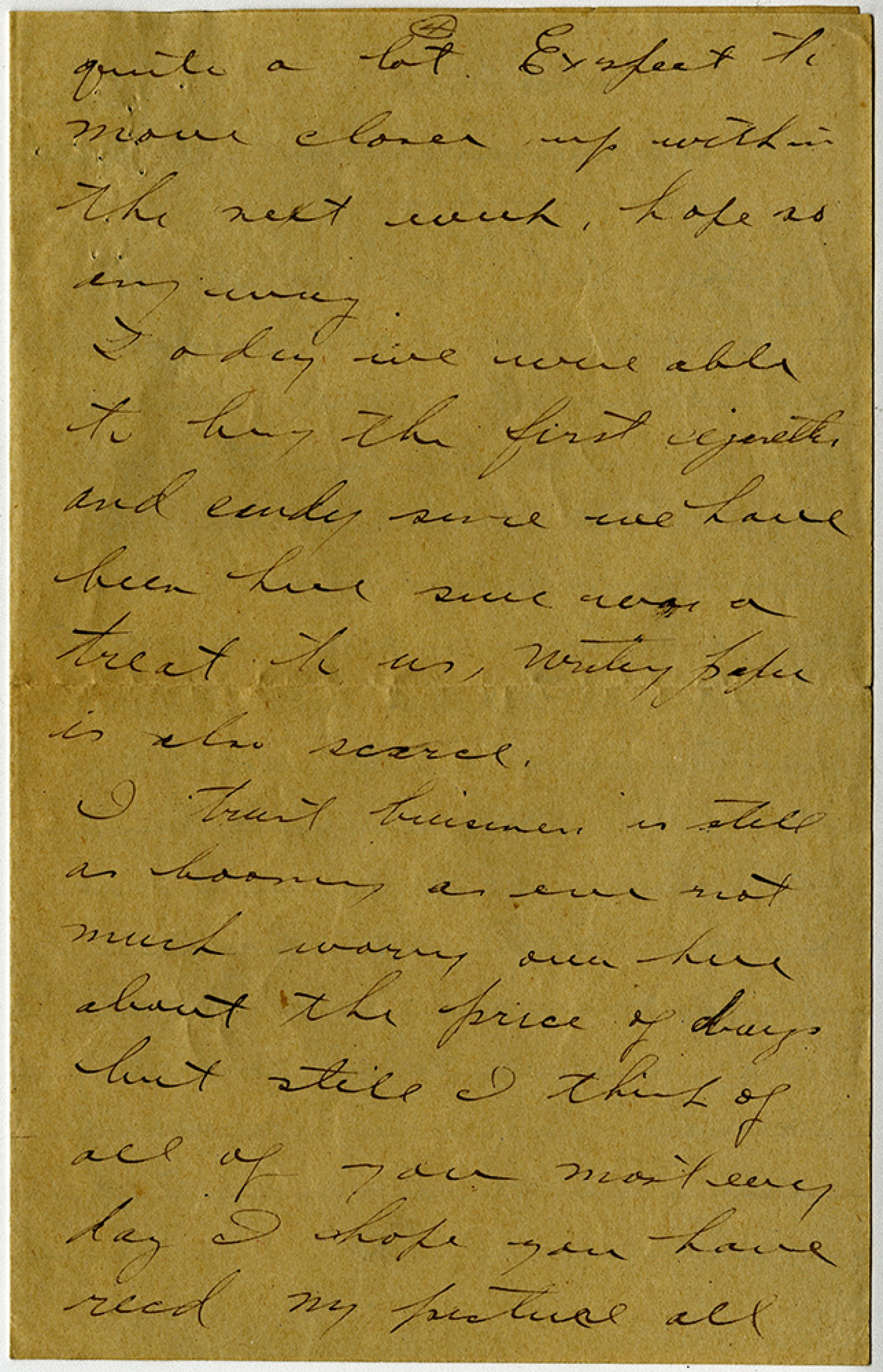 [page 4] quite a lot. Expect to move closer up with in the next week, hope so any way. Today we were able to buy the first cigarettes and candy since we have been here sure was a treat to us, writing paper is also scarce. I trust business is still as booming as ever not much worry over here about the price of drugs but still I thing of all of you most every day I hope you have recd my picture all
