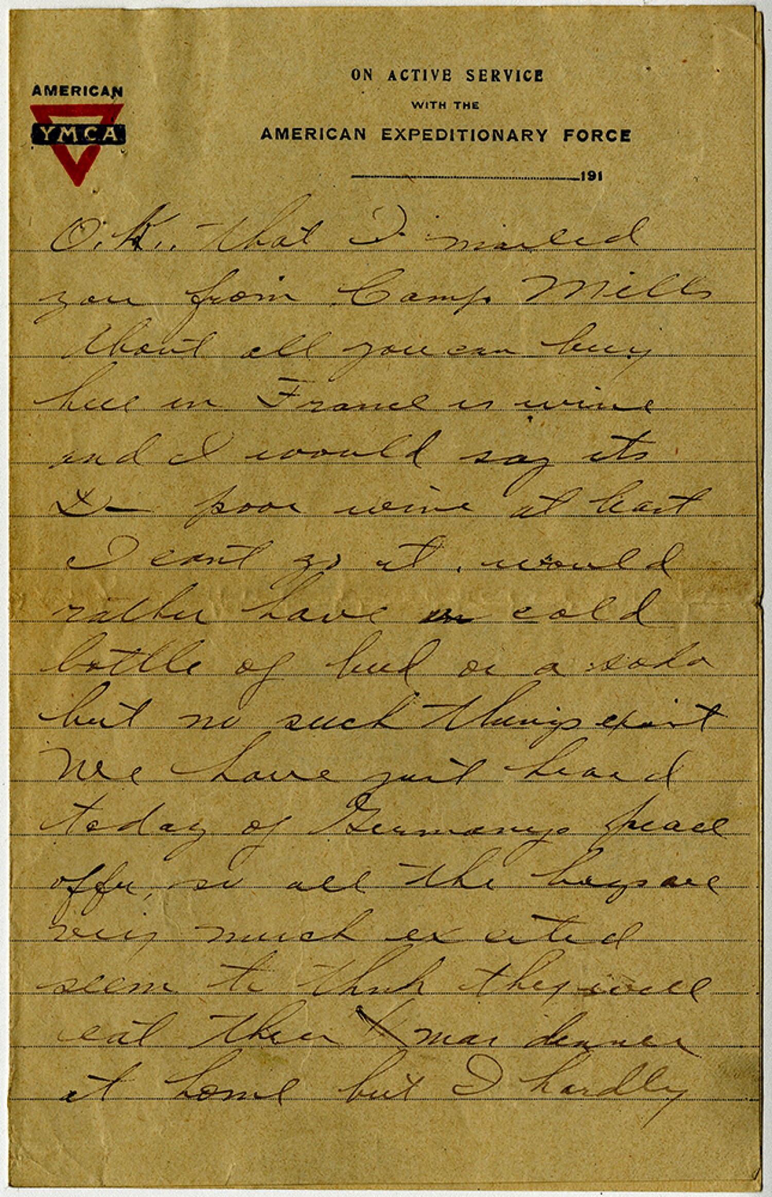 O.K. that I mailed you from Camp Mills About all you can buy here in France is wine and I would say its D- poor wine at best I cant go it would rather have a cold bottle of bud or a soda but no such things exist We have just heard today of Germanys peace offer so all the boys are very much excited seem to think they will eat their Xmas dinner at home but I hardly