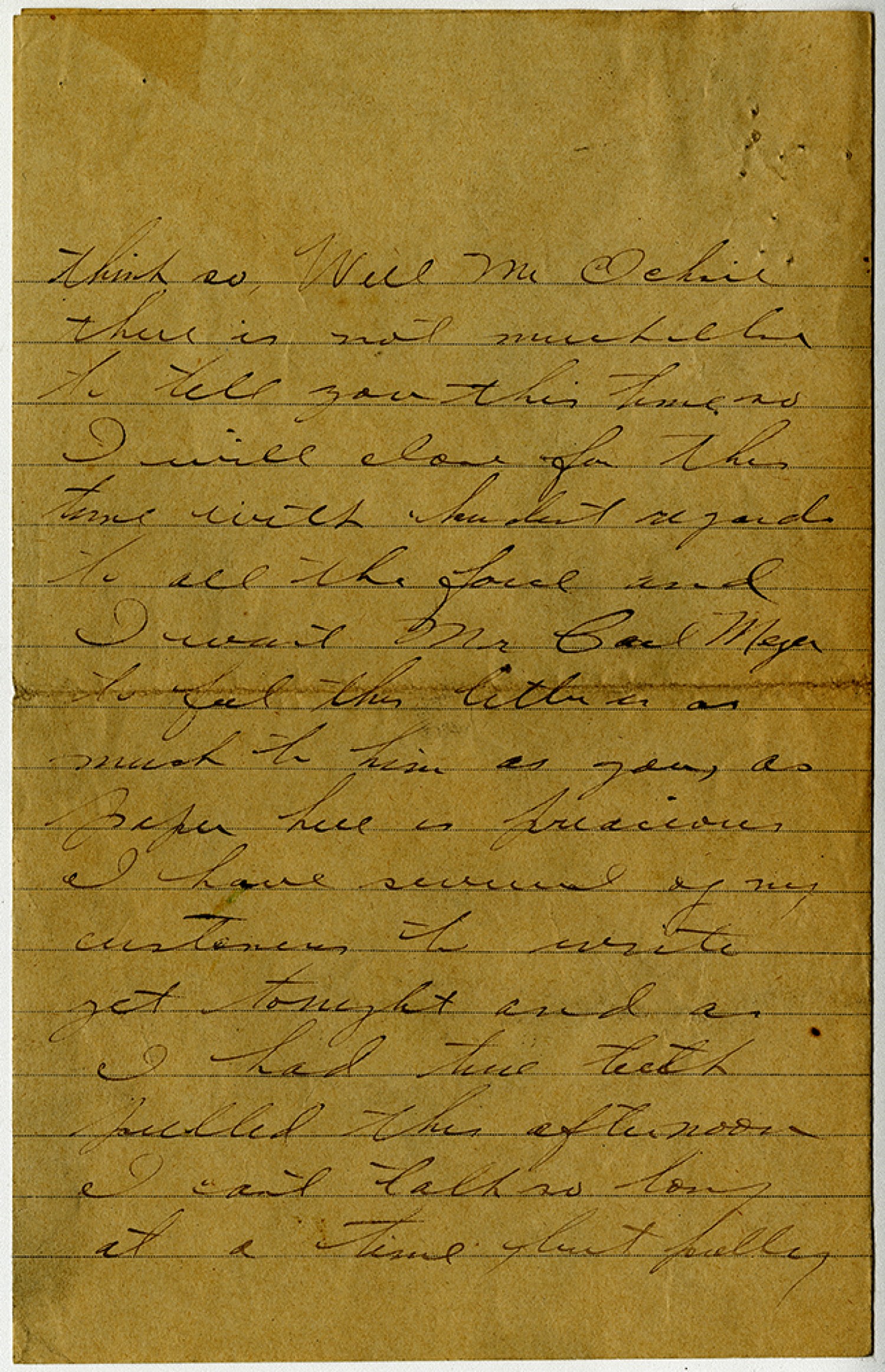 think so, Well Mr. Ochsie there is not much else to tell you this time so I will close for this time with kindest regards to all the force and I want Mr. Carl Meyer to feel this letter is as much to him as you, as paper here is precious. I have several of my customers to write yet tonight and a I had two teeth pulled this afternoon I cant talk so long at a time but pulling