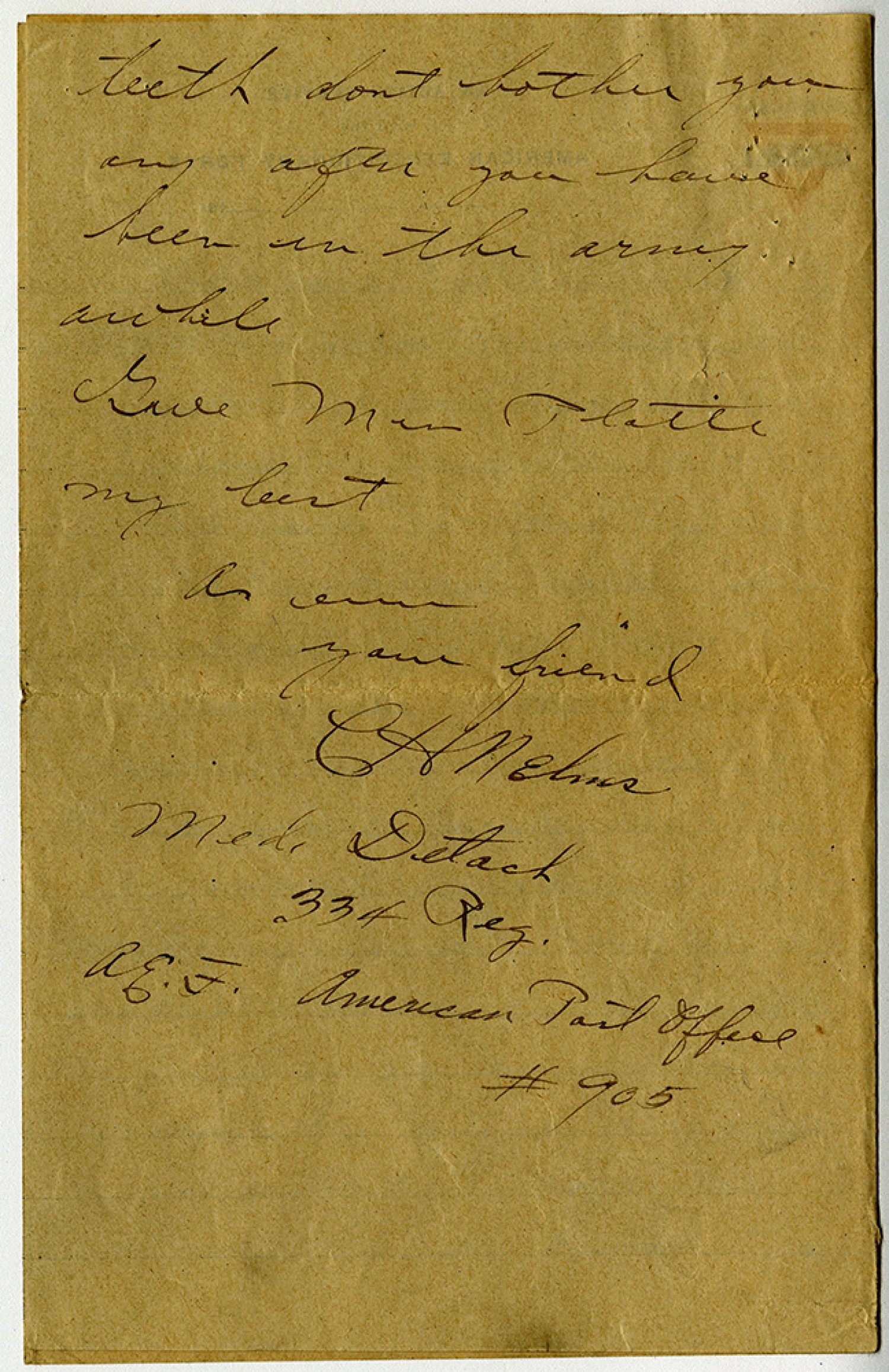 teeth dont bother you any after you have been in the army awhile. Give Mr Platte my best As ever your friend C.H. Nelms Med. Detach 334 Reg. [American Expeditionary Forces] American Post Office #905