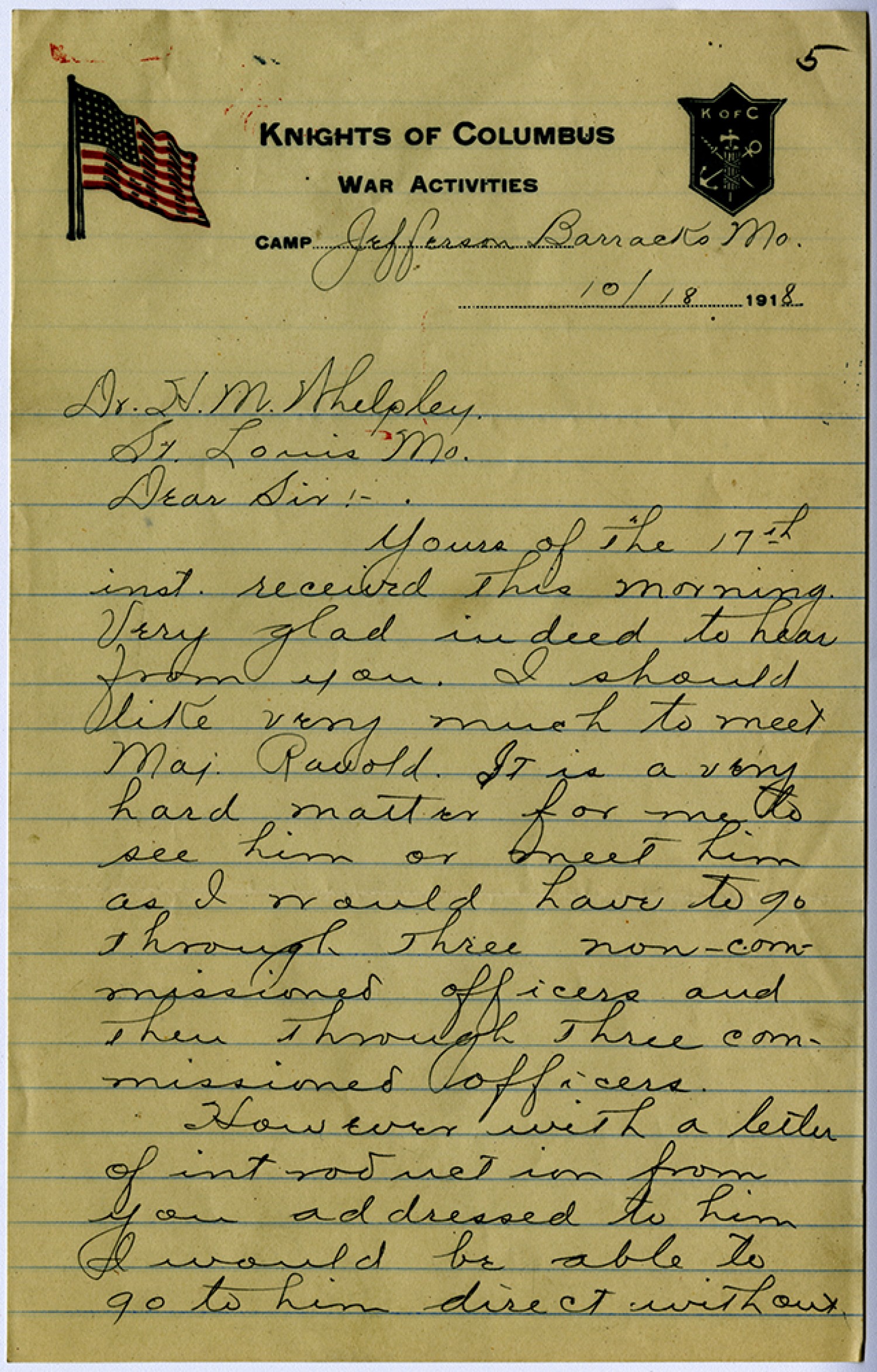 Jefferson Barracks [Missouri] [October 18, 1918] Dr. [Henry Milton] Whelpley St. Louis [Missouri] Dear Sir:- Yours of the 17th inst. received this morning. Very glad indeed to hear from you. I should like very much to meet Maj Rauold. It is a very hard matter for me to see him or meet him as I would have to go through three non-commissioned officers and then through three commissioned officers. However with a letter of introduction from you addressed to him I would be able to go to him direct without
