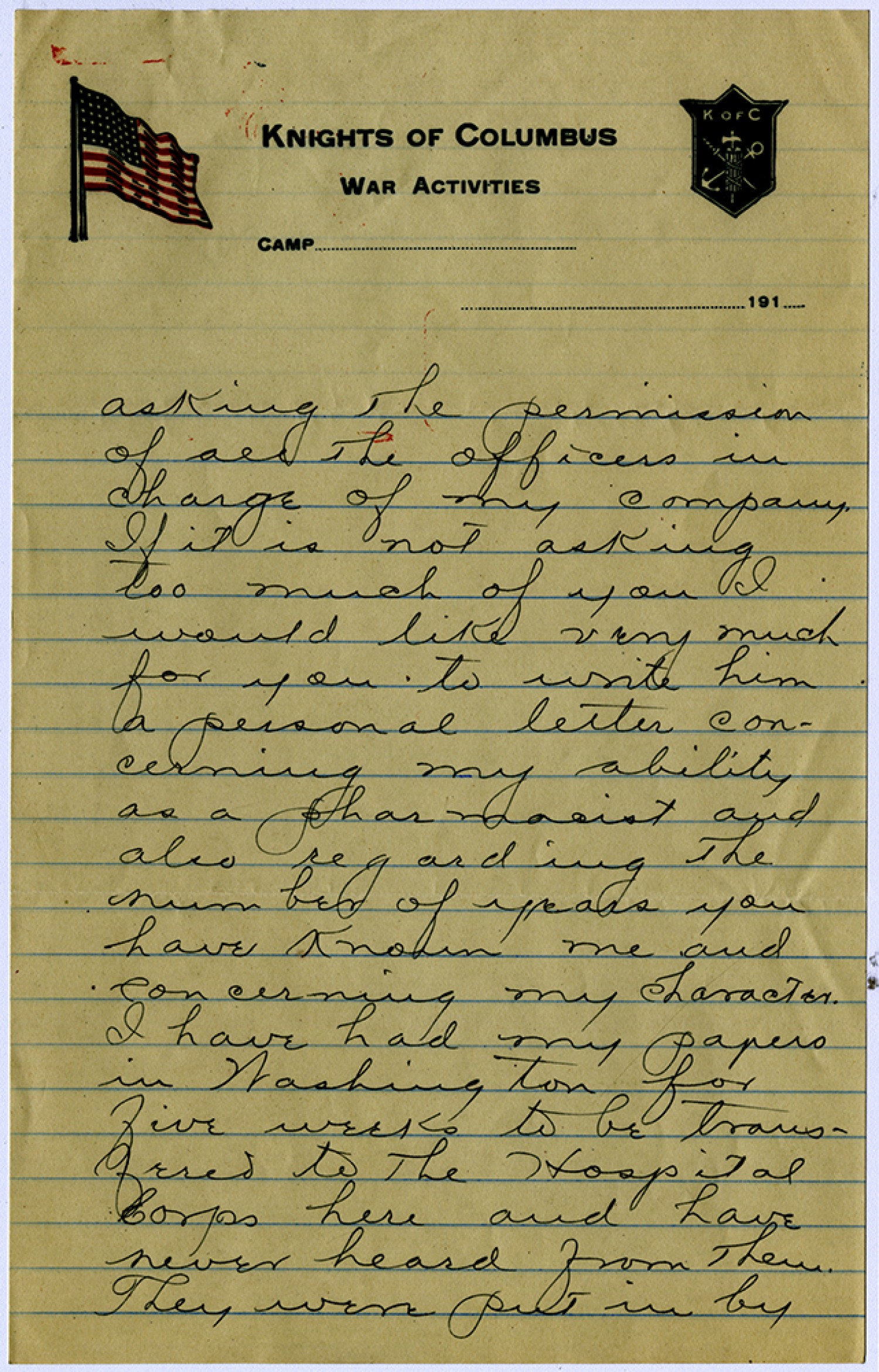 asking the permission of all the officers in charge of my company. If it is not asking too much of you I would like very much for you to write him a personal letter concerning my ability as a pharmacist and also regarding the number of years you have known me and concerning my character. I have had my papers in Washington for five weeks to be transfered to the Hospital Corps here and have never heard from them. They were put in by