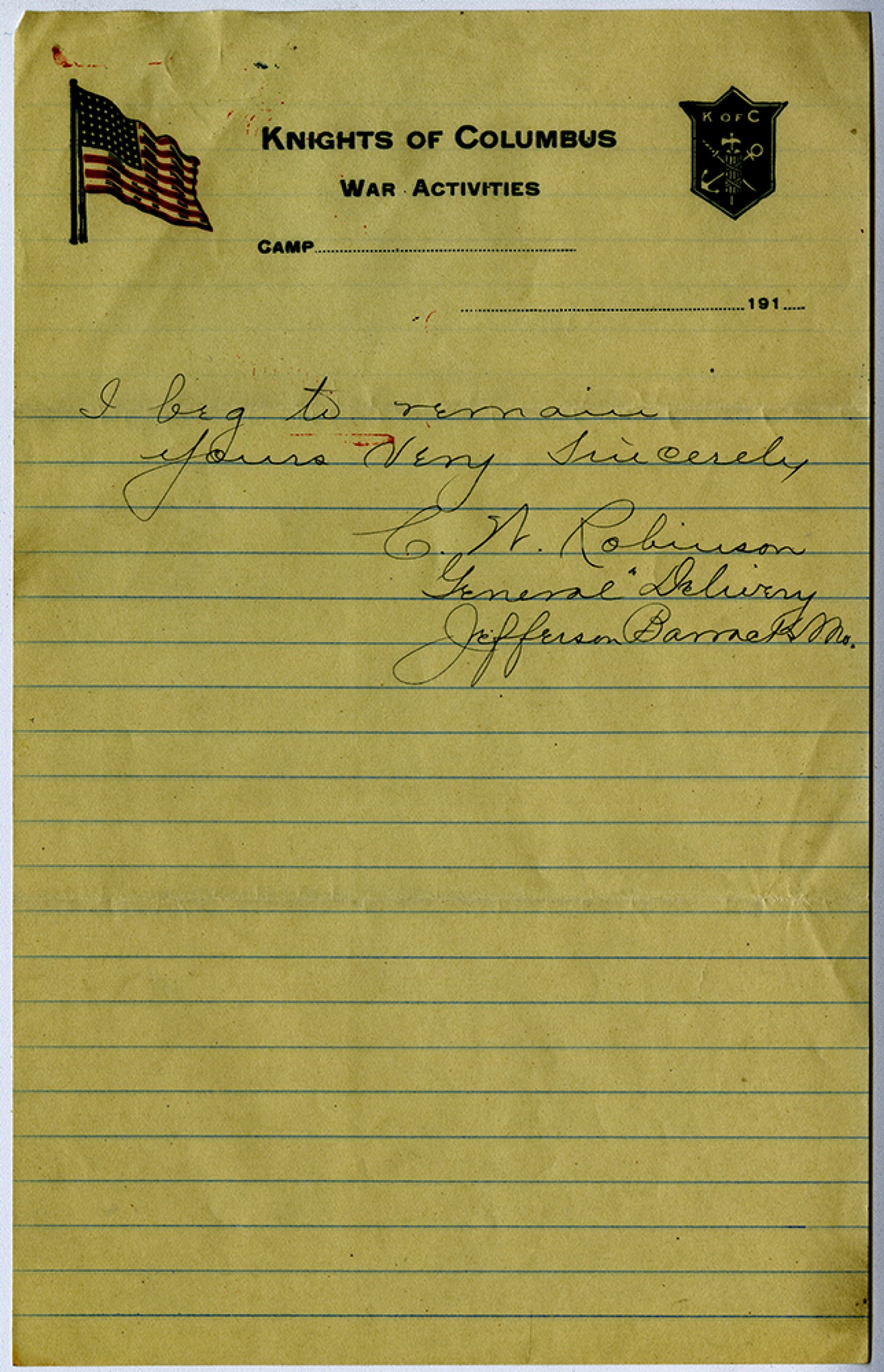 I beg to remain yours Very Sincerely C.W. Robinson General Delivery Jefferson Barracks [Missouri]