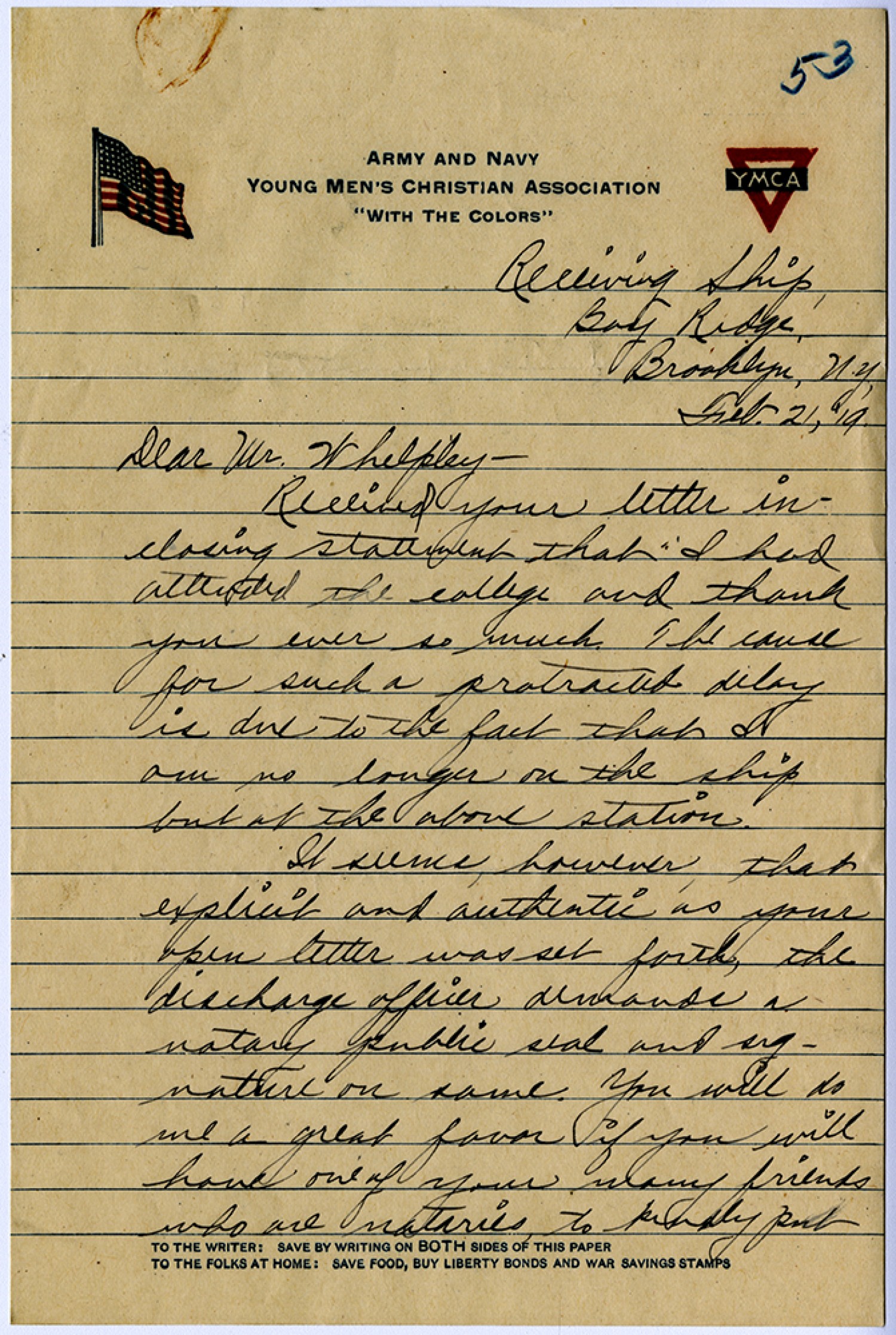 Receiving Ship, Bay Ridge, Brooklyn, [New York], [February] 21, [1919] Dear Mr. Whelpley- Received your letter in closing statement that I had attended the college and thank you ever so much. The cause for such a protracted delay is due to the fact that I am no longer on the ship but at the above station. It seems however, that explicit and authentic as your open letter was set forth, the discharge officer demands a notary public seal and signature on same. You will do me a great favor if you will have one of your many friends who are notaries to kindly put