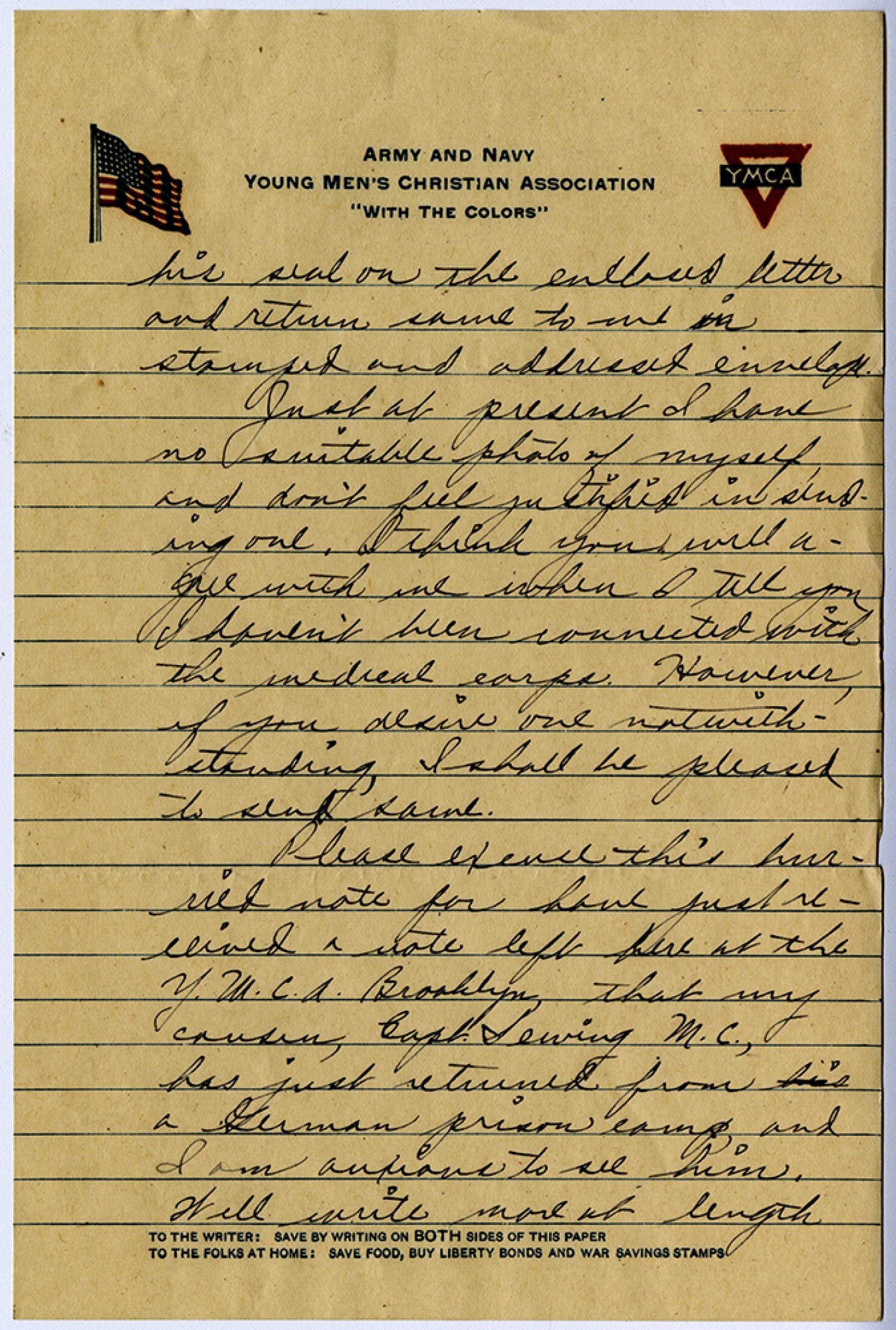 his seal on the enclosed letter and return same to me in stamped and addressed envelope. Just at present I have no suitable photo of myself and don’t feel justified in sending one. I think you will agree with me when I tell you I haven’t been connected with medical corps. However, if you desire one notwithstanding, I shall be pleased to send same. Please excuse this hurried note for have just received a note left here at the Y.M.C.A. Brooklyn, that my cousin, Corp Sewing M.C., has just returned from a German prison camp, and I am anxious to see him. Will write more at length