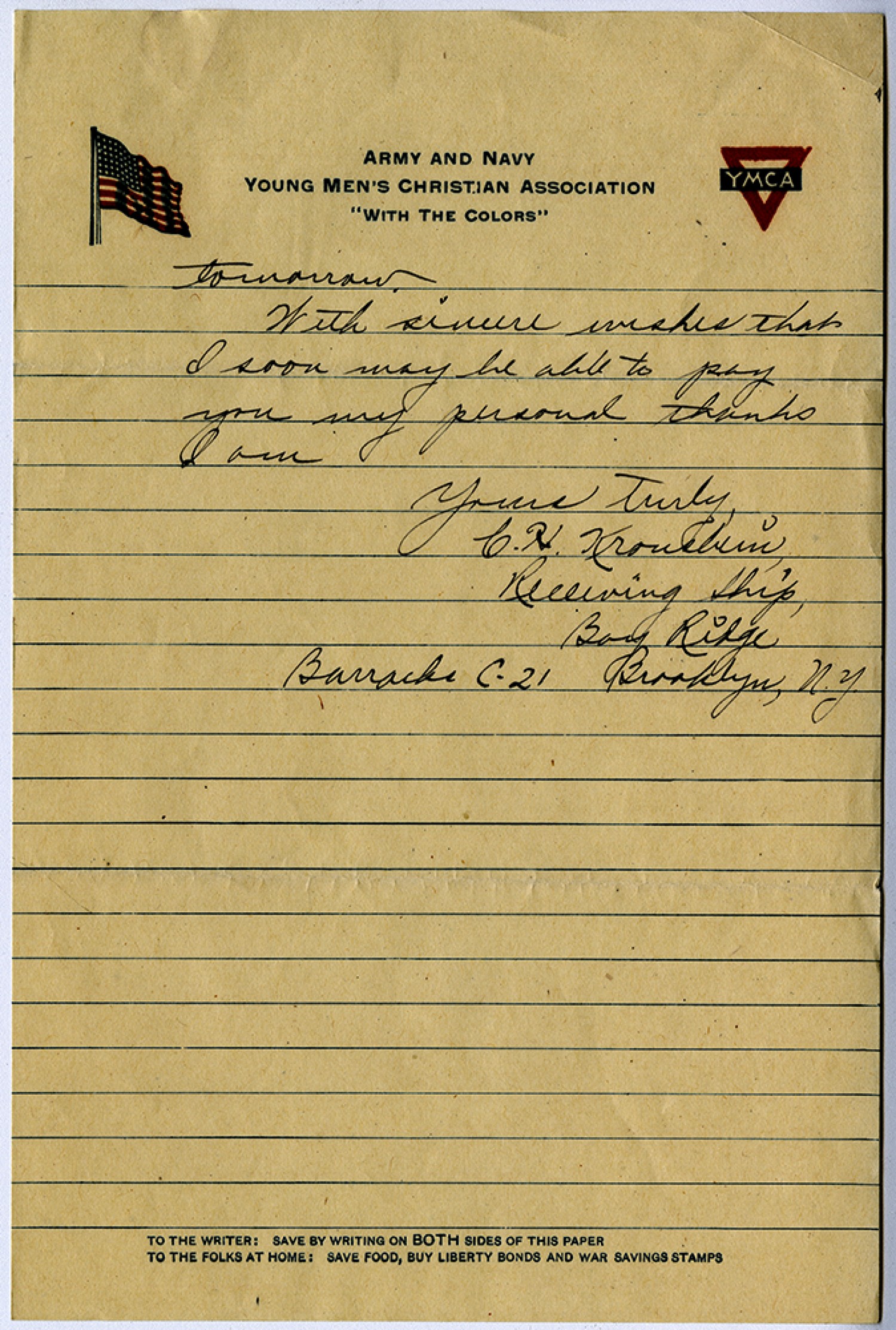 tomorrow. With sincere wishes that I soon may be able to pay you my personal thanks I am Yours truly C. H. Krousbien Receiving Ship, Bay Ridge Barracks C-21 Brooklyn, [New York]
