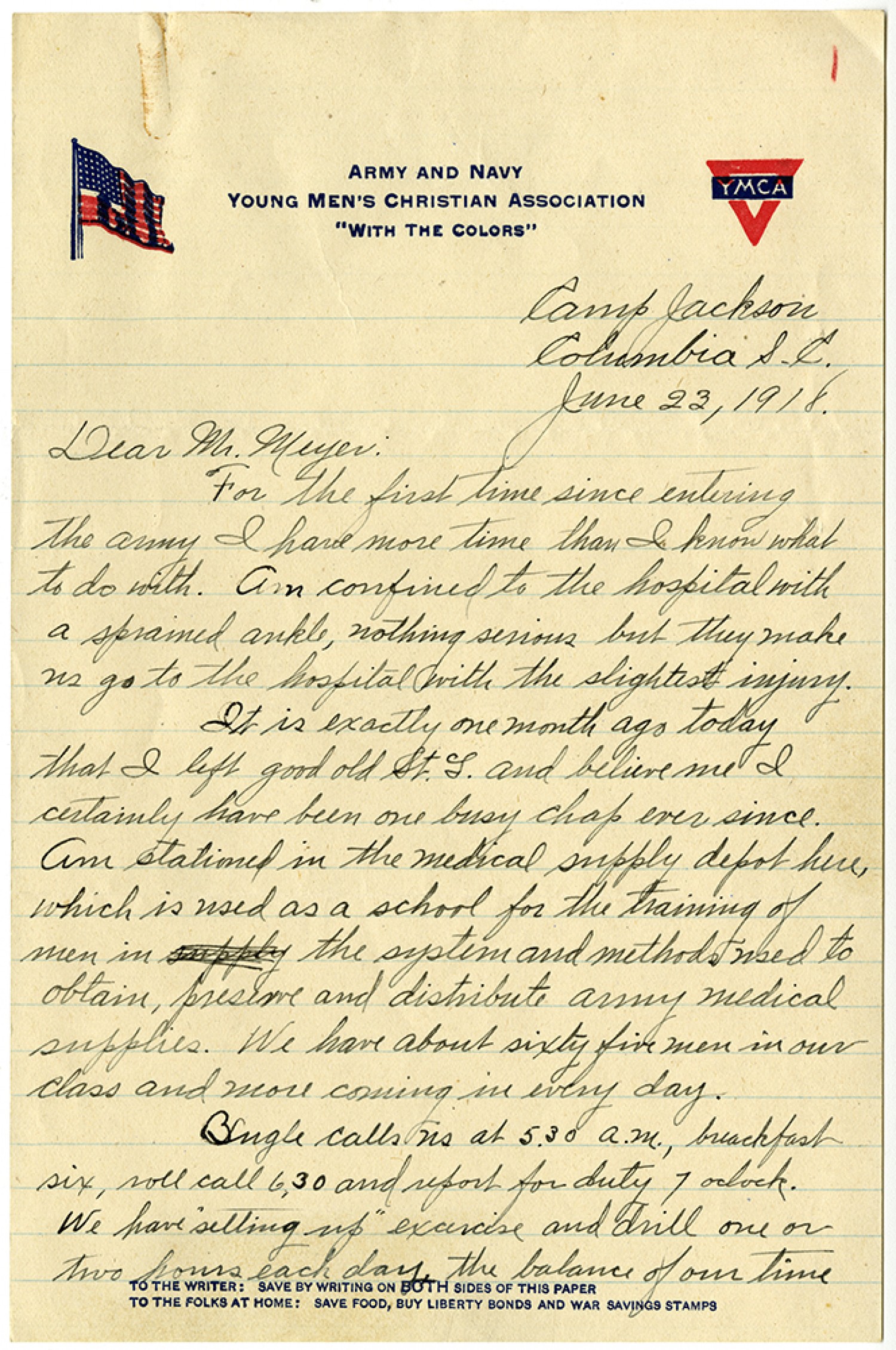 Camp Jackson Columbia [South Carolina] June 23, 1918. Dear Mr. Meyer: For the first time since entering the army I have more time than I know what to do with. Am confined to the hospital with a sprained ankle, nothing serious but they make us go to the hospital with the slightest injury. It is exactly one month ago today that I left good old [St. Louis] and believe me I certainly have been one busy chap ever since. Am stationed in the medical supply depot here, which is used as a school for the training of men in the system and methods used to obtain, preserve and distribute army medical supplies. We have about sixty five men in our class and more coming in every day. Bugle calls us at 5:30 a.m., breakfast six, roll call 6 30 and report for duty 7 oclock. We have “setting up” excercise and drill one or two hours each day the balance of our time