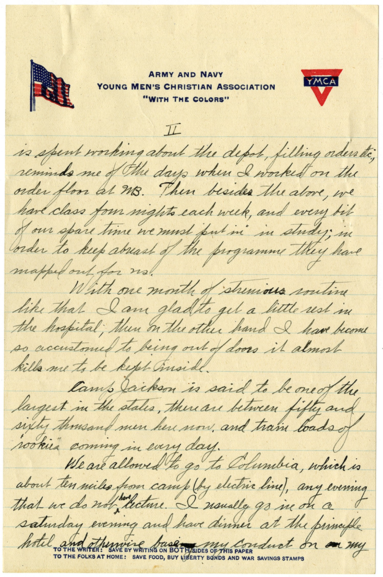 [page 2] is spent working about the depot, filling orders etc.; reminds me of the days when I worked on the order floor at WB. Then besides the above, we have class four nights each week, and every bit of our spare time we must “put in” in study; in order to keep abreast of the programme they have mapped out for us. With one month of strenious routine like that I am glad to get a little rest in the hospital, then on the other hand I have become so accustomed to being out of doors it almost kills me to be kept inside. Camp Jackson is said to be one of the largest in the states, there are between fifty and sixty thousand men here now, and train loads of “rookies” coming in every day. We are allowed to go to Columbia, which is about ten miles from camp (by electric line), any evening that we do not have lecture. I usually go in on a saturday evening and have dinner at the principle hotel and otherwise base my conduct on my