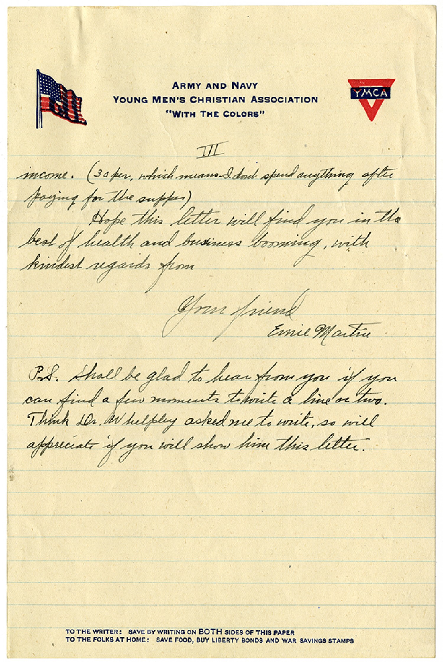 [page 3] income (30 per, which means I dont spend anything after paying for the supper) Hope this letter will find you in the best of health and business booming, with kindest regards from Your friend Ernie Martin P.S. Shall be glad to hear from you if you can find a few moments to write a line or two. Think Dr. Whelpley asked me to write, so will appreciate if you will show him this letter.