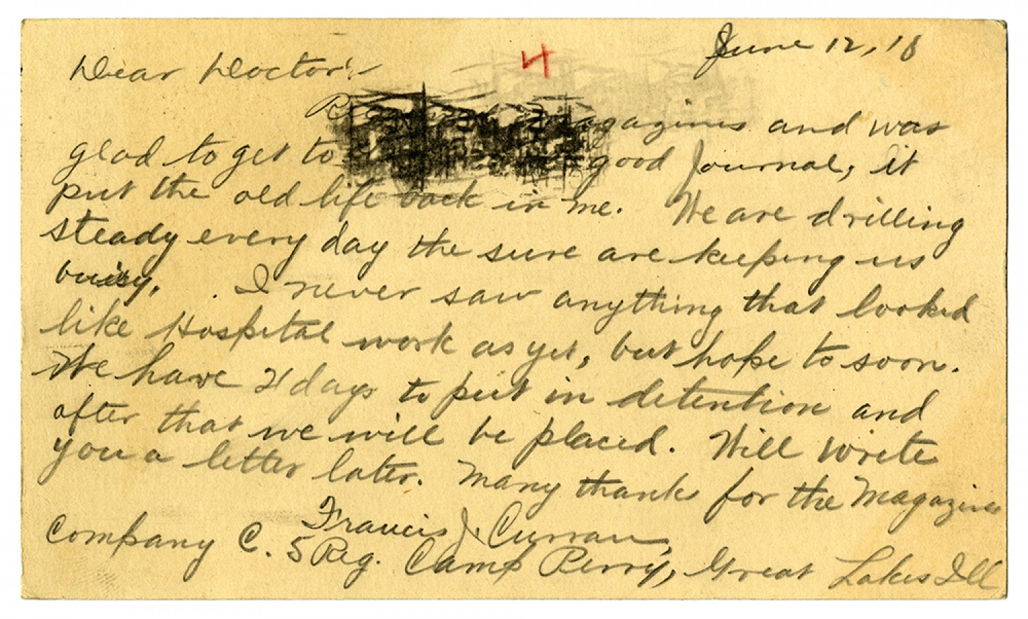 June 12, [1918] Dear Doctor: - [ms illegible: 2 wds] magazines and was glad to get to [ms illegible: 2 wds] good journal, it put the old life back in me. We are drilling steady every day the sure are keeping us busy. I never saw anything that looked like Hospital work as yet, but hope to soon. We have 21 days to put in detention and after that we will be placed. Will write you a letter later. Many thanks for the magazines Francis Curran Company C. 5 [Regiment] Camp Perry, Great Lakes [Illinois]