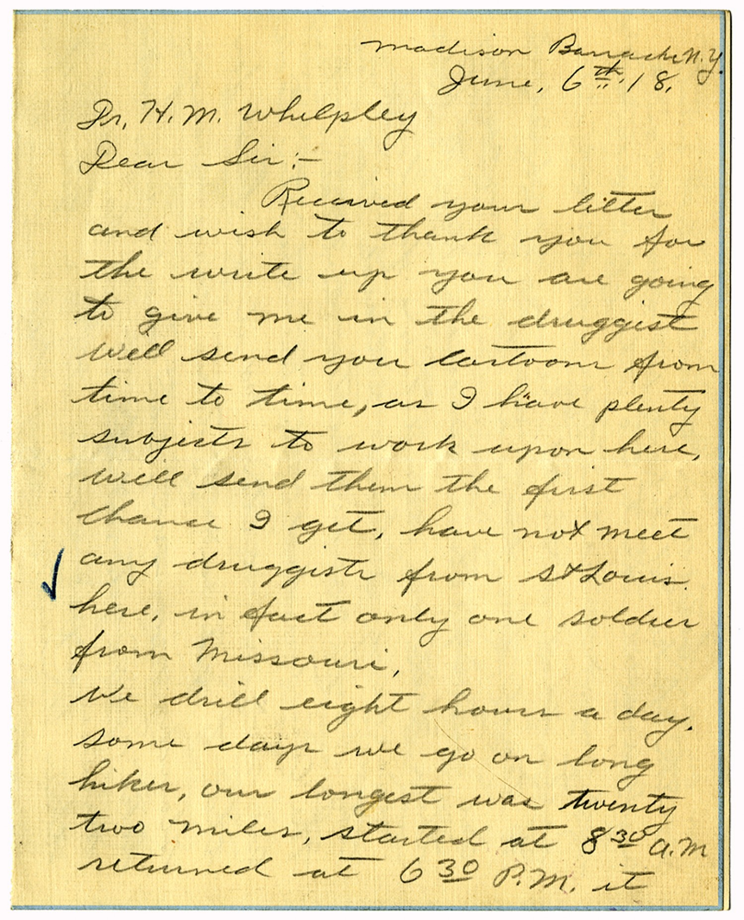 Madison Barracks [New York] June 6th, [1918]. Dr. [Henry Milton] Whelpley Dear Sir: - Received your letter and wish to thank you for the write up you are going to give me in the druggist will send you cartoons from time to time, as I have plenty subjects to work upon here, will send them the first chance I get, have not meet any druggists from St. Louis here, in fact only one soldier from Missouri. We drill eight hours a day. some days we go on long hikes, our longest was twenty two miles, started at 830 a.m returned at 630 p.m. it