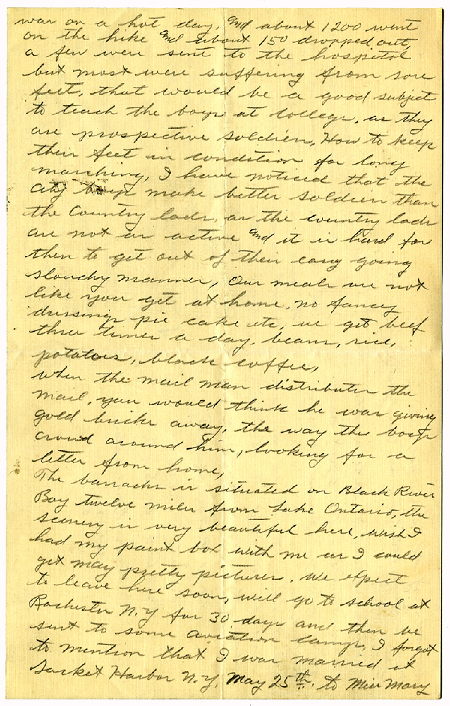 was on a hot day, and about 1200 went on the hike and about 150 dropped out, a few were sent to the hospital but most were suffering from sore feet, that would be a good subject to teach the boys at college, as they are prospective soldiers, How to keep their feet in condition for long marching, I have noticed that the city boys make better soldier than the country lads or the country lads are not as active and it is hard for them to get out of their easy going slouchy manner, Our meals are not like you get at home. No fancy dressings pie cake etc, we get beef three times a day, beans, rice, potatoes, black coffee, when the mail man distributes the mail, you would think he was giving gold bricks away, the way the boys crowd around him, looking for a letter from home, The barracks is situated on Black River Bay twelve miles from Lake Ontario, the scenery is very beautiful here, wish I had my paint box with me as I could get many pretty pictures. We expect to leave here soon, will go to school at Rochester [New York] for 30 days and then be sent to some aviation camp I forgot to mention that I was married at Sacket Harbor [New York] May 25th to Miss Mary