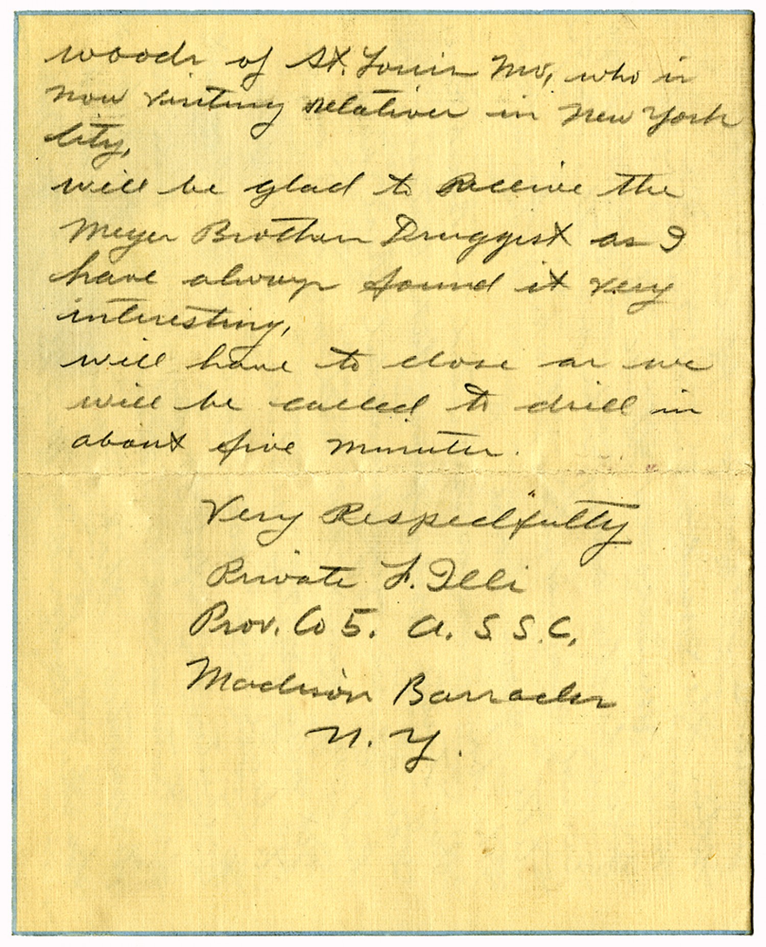 Woods of St. Louis [Missouri], who is now visiting relatives in New York City. Will be glad to receive the Meyer Brothers Druggist as I have always found it very interesting. will have to close as we will be called to drill in about five minutes. Very Respectfully Private F. Illi Prov. Co 5. A.S.S.C. Madison Barracks [New York]