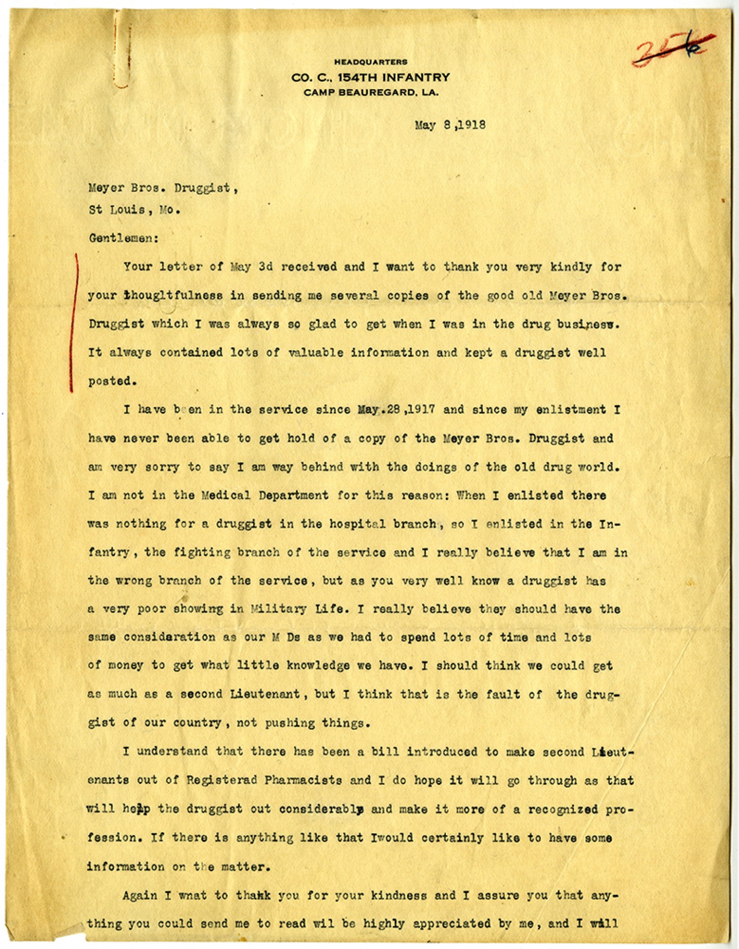 HEADQUARTERS CO. C. 154TH INFANTRY CAMP BEAUREGARD, [Louisiana] May 8, 1918 Meyer [Brothers] Druggist, [St. Louis, Missouri] Gentlemen: Your letter of May 3d received and I want to thank you very kindly for your thoughtfulness in sending me several copies of the good old Meyer [Brothers] Druggist which I was always so glad to get when I was in the drug business. It always contained lots of valuable information and kept a druggist well posted. I have been in the service since May. 28, 1917 and since my enlistment I have never been able to get hold of a copy of the Meyer [Brothers] Druggist and am very sorry to say I am way behind with the doings of the old drug world. I am not in the Medical Department for this reason: When I enlisted there was nothing for a druggist in the hospital branch, so I enlisted in the Infantry, the fighting branch of the service and I really believe that I am in the wrong branch of service, but as you very well know a druggist has a very poor showing in Military life. I really believe they should have the same consideration as our M Ds as we had to spend lots of time and lots of money to get what little knowledge we have. I should think we could get as much as a second Lieutenant, but I think that is the fault of the druggists of our country, not pushing things. I understand that there has been a bill introduced to make second Lieutenants out of Registered Pharmacists and I do hope it will go through as that will help the druggists out considerably and make it more of a recognized profession. If there is anything like that I would certainly like to have some information on the matter. Again I want to thank you for your kindness and I assure you that anything you could send me to read will be highly appreciated by me, and I will