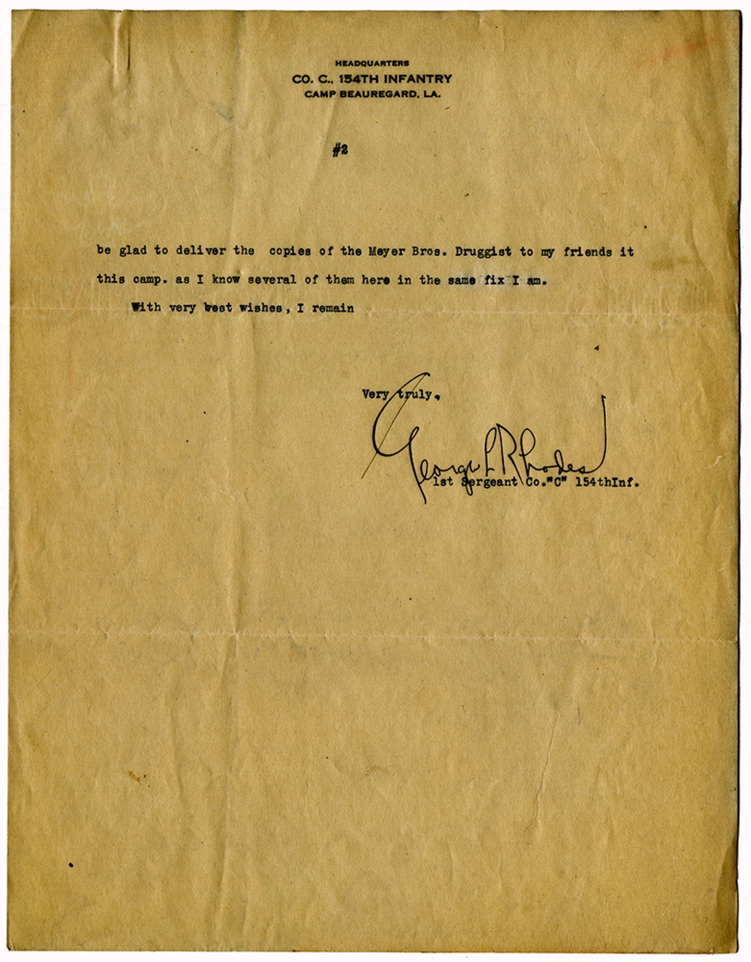 [page 2] be glad to deliver the copies of the Meyer [Brothers] Druggist to my friends it this camp. as I know several of them here in the same fix I am. With very best wishers, I remain Very truly, [signature] George L. Rhodes, 1st Sergeant Co. “C” 154th Inf.