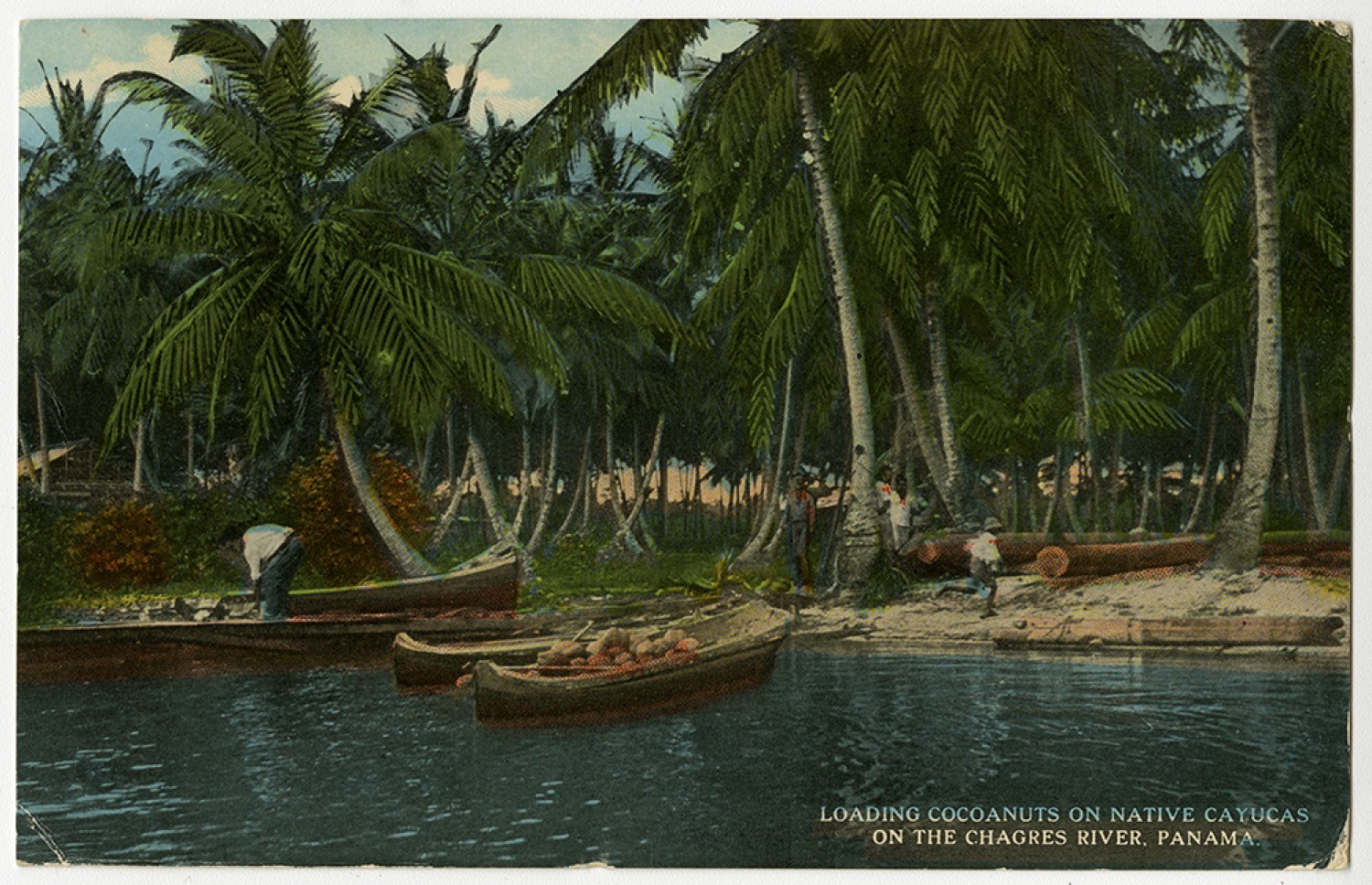 LOADING COCOANUTS ON NATIVE CAYUCAS ON THE CHAGRES RIVER. PANAMA.
