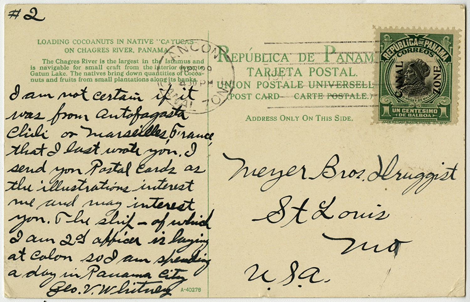#2 I am not certain if it was from Autofagasta Chili or Marseilles, France, that I last wrote you. I send you postal cards as the illustrations interest me and may interest you. The ship – of which I am 2nd officer is laying at Colon so I am spending a day in Panama City [George] V. Whitney Meyer [Brothers] Druggist St. Louis [Missouri] U.S. A.