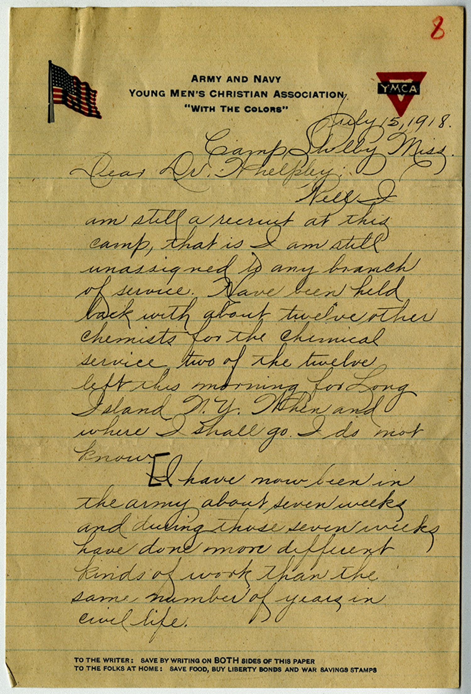 July 15, 1918. Camp Shelby [Mississippi] Dear Dr. Whelpley: Well I am still a recruit at this camp, that is I am still unassigned to any branch of service. Have been held back with about twelve other chemists for the chemical service two of the twelve left this morning for Long Island [New York] When and where I shall go I do not know. (I have now been in the army about seven weeks and during those seven weeks have done more different kinds of work than the same number of years in civil life.