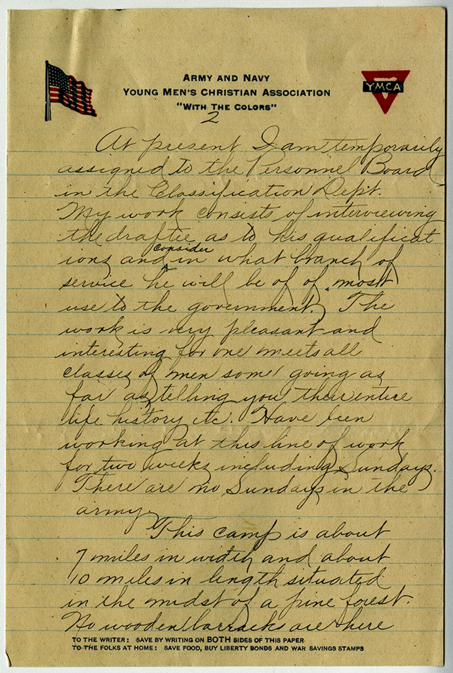 [page 2] At present I am temporarily assigned to the Personnel Board in the Classification Dept. My work consists of interviewing the draftee as to his qualifications and consider in what branch of service he will be of of most use to the government. The work is very pleasant and interesting for one meets all classes of men some going as far as telling you their entire life history etc. Have been working at this line of work for two weeks including Sundays. There are no Sundays in the army. This camp is about 7 miles in width and about 10 miles in length situated in the midst of a pine forest. No wooden barracks are here