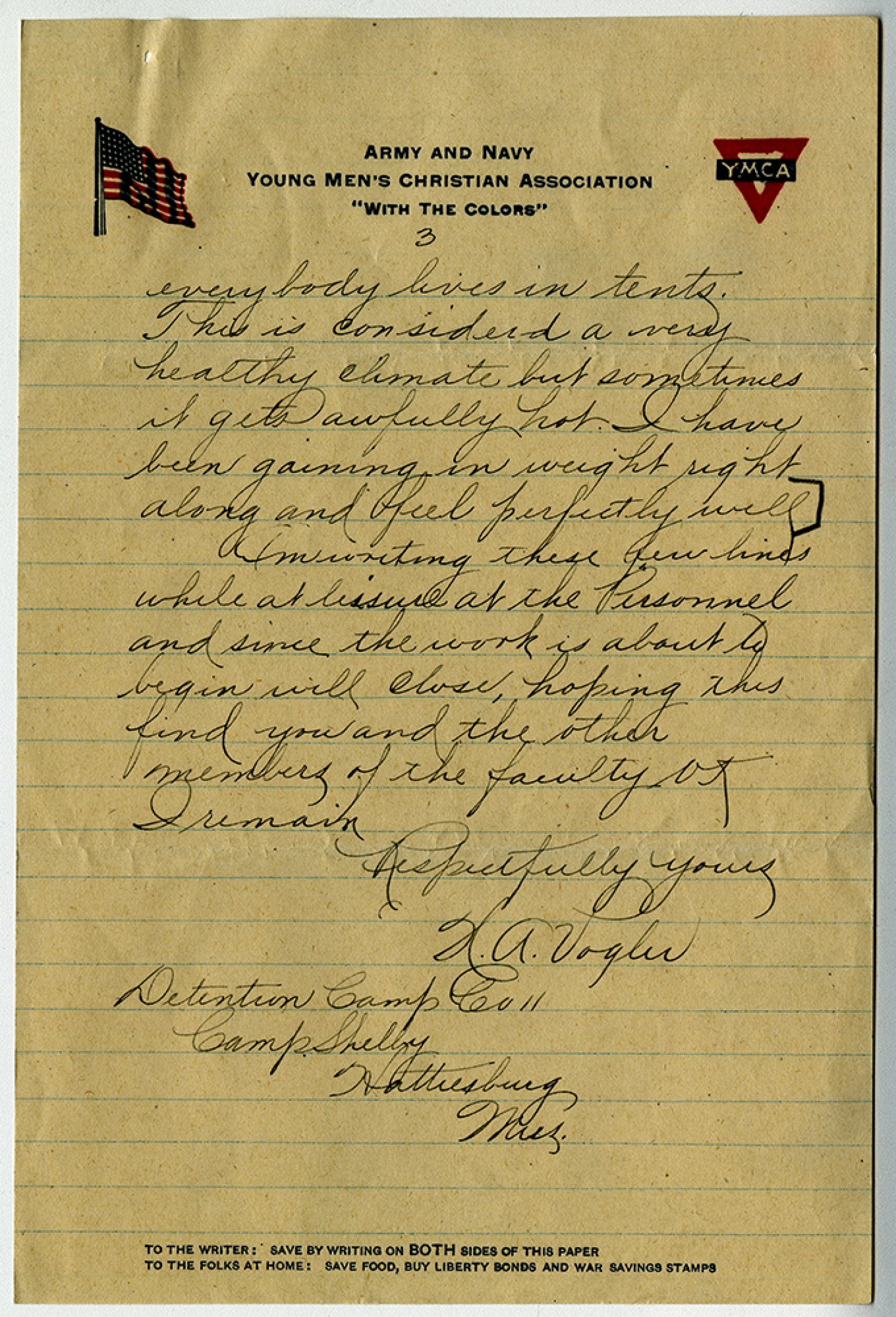 [page 3] everybody lives in tents. This is considered a very healthy climate but sometimes it gets awfully hot. I have been gaining in weight right along and feel perfectly well) Am writing these few lines while at leisure at the Personnel and since the work is about to begin will close, hoping this find you and the other members of the faculty OK I remain Respectfully yours H.A. Vogler Detention Camp Co 11 Camp Shelby Hattiesburg [Mississippi]