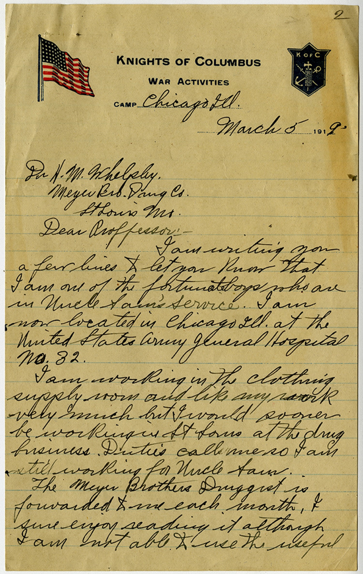 Camp Chicago [Illinois] March 5, [1919] Dr. [Henry Milton] Whelpley. Meyer [Brothers] Drug [Company] St. Louis [Missouri] Dear Proffessor:- I am writing you a few lines to let you know that I am one of the fortunate boys who are in Uncle Sam’s Service. I am now located in Chicago [Illinois] at the United States Army general Hospital No 32. I am working in the clothing supply room and like my work very much but I would sooner be working in St. Louis at the drug business. Duties call me so I am still working for Uncle Sam. The Meyer Brothers Druggist is forwarded to me each month, I sure enjoy reading it although I am not able to use the useful