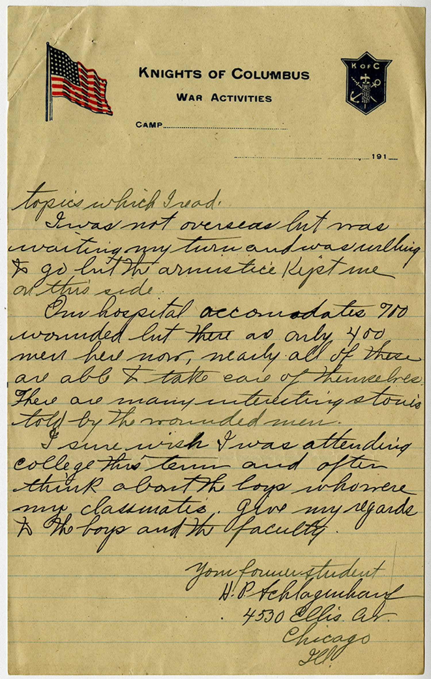 topics which I read. I was not overseas but was waiting my turn and was willing to go but the armistice kept me on this side. Our hospital accomodates 700 wounded but there are only 400 men here now, nearly all of these are able to take care of themselves. There are many interesting stories told by the wounded men. I sure wish I was attending college this term and often think about the boys who were my classmates. give my regards to the boys and the faculty. Your former student H.P. Schlagenharf 4530 Ellis Av. Chicago, [Illinois]