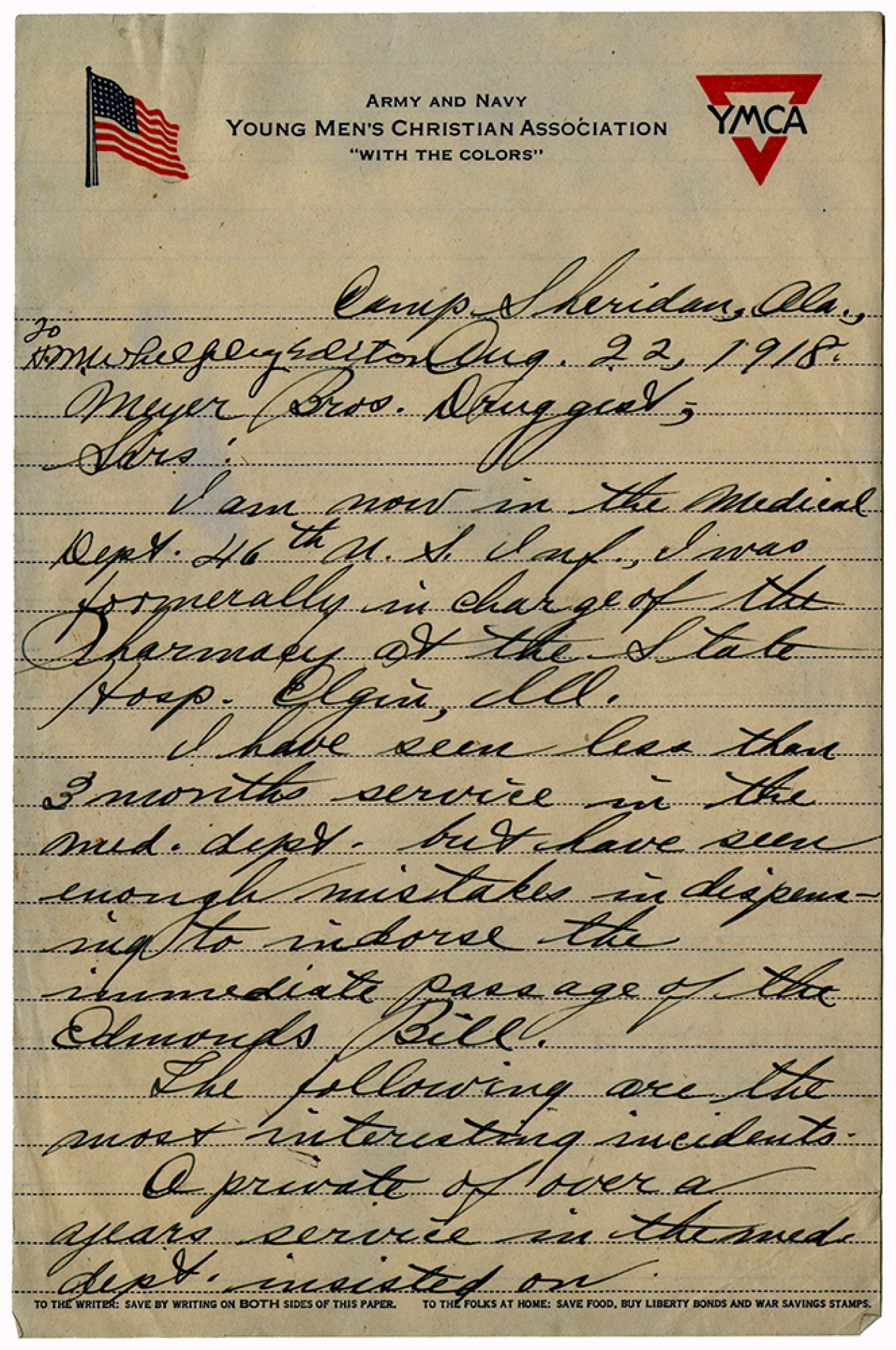 Camp Sheridan, [Alabama], [August] 22, 1918. To [Henry Milton] Whelpley Editor Meyer [Brothers] Druggist, Sirs: I am now in the Medical Dept. 46th U.S., Inf., I was formerally in charge of the Pharmacy at the State Hosp. Olgin, [Illinois]. I have seen less than 3 months service in the med. dept. but have seen enough mistakes in dispensing to indorse immediate passage of the Edmonds Bill. The following are the most interesting incidents. A private of over a years service in the med dept. insisted on