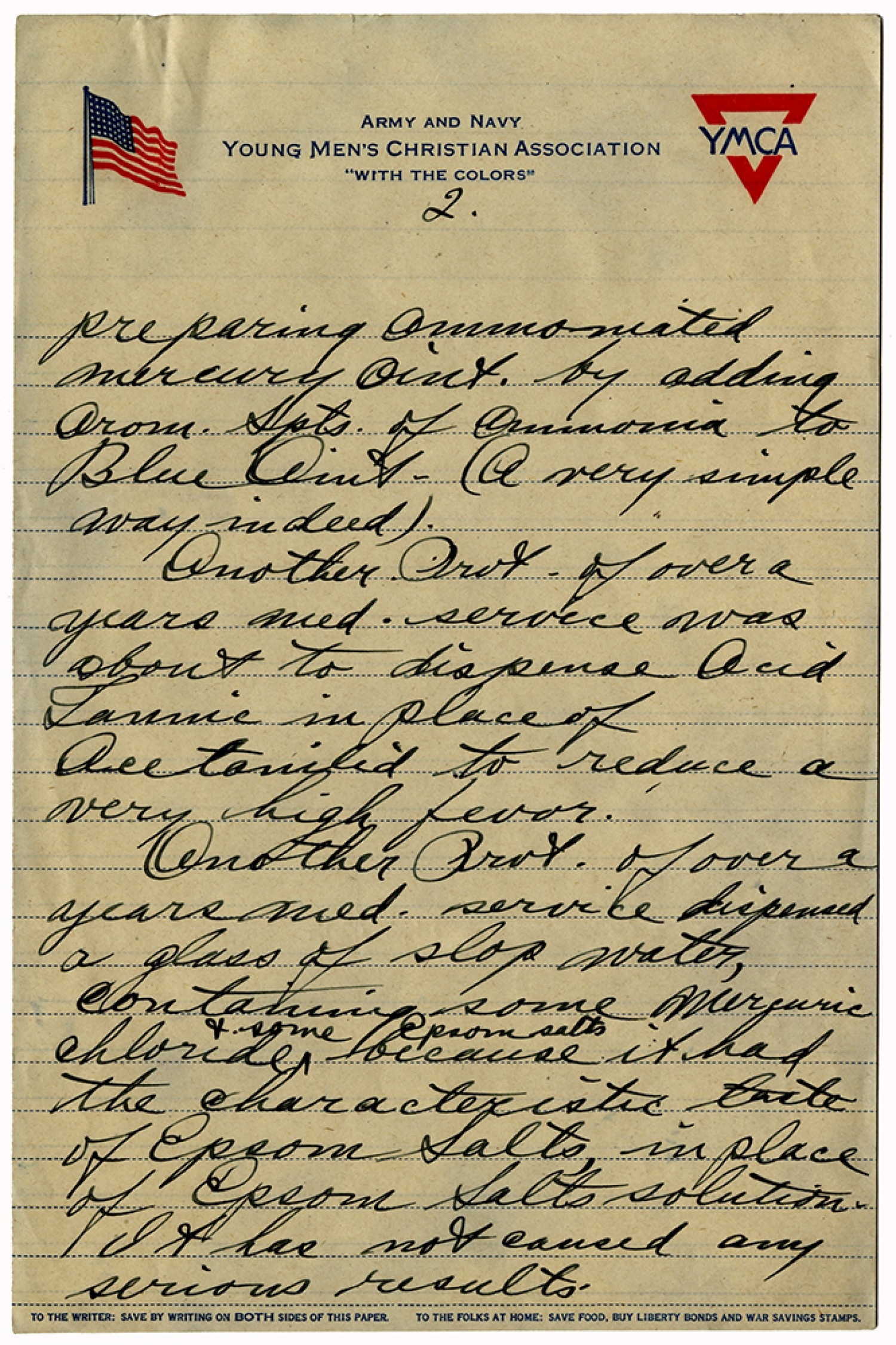 [page 2] preparing ammoniated mercury oint. by adding Arom. Spts. of ammonia to Blue Oint. (A very simple way indeed). Another Prvt. of over a years med. service was about to dispense Acid Tonnic in place of Acetoniled to reduce a over high fevor. Another Prvt. of over a years med. service dispensed a glass of slop water, containing some Mercuric chloride & some epsom salts because it had the characteristic taste of Epsom Salts in place of Epsom Salts solution. It has not caused any serious results.