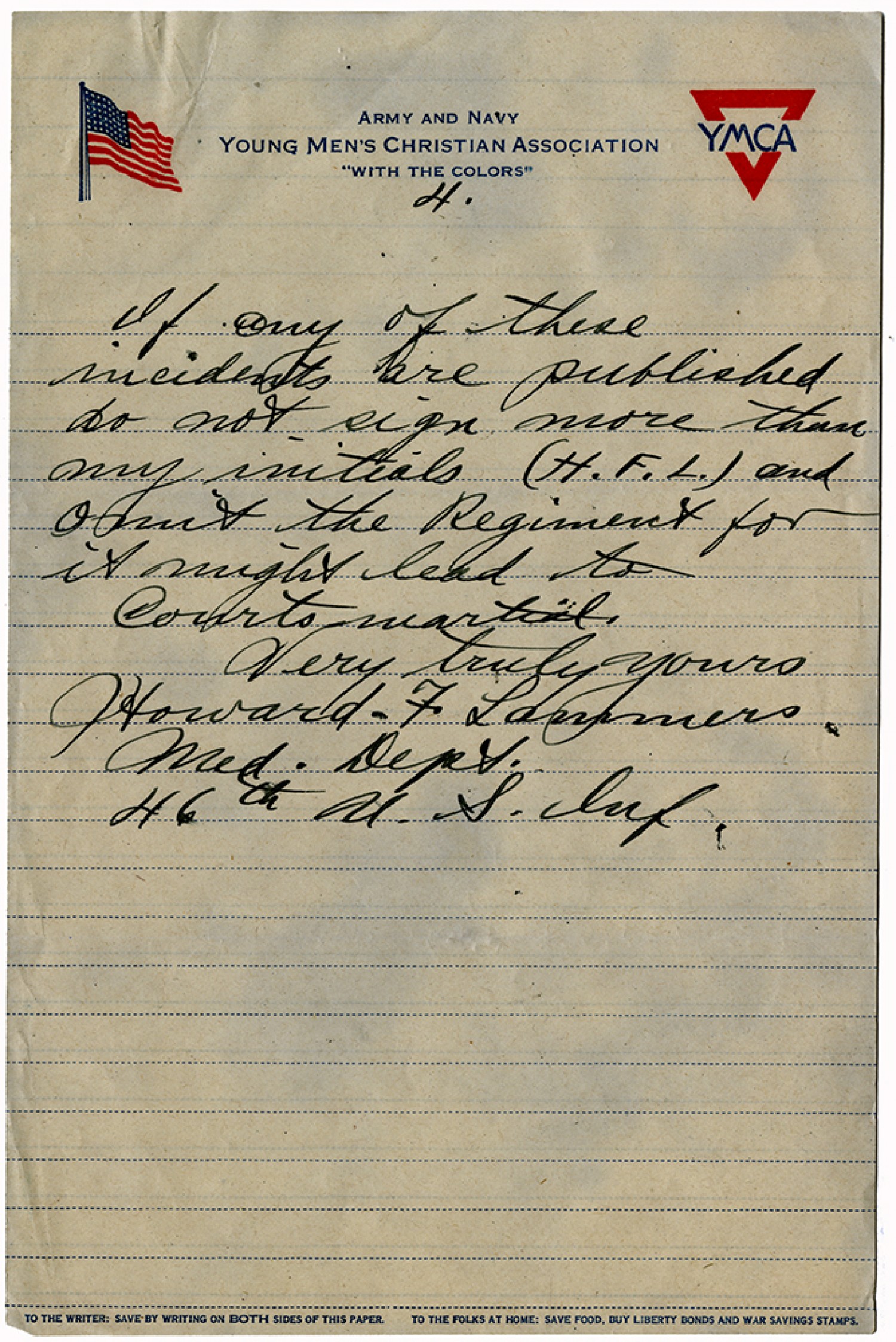 [page 4] If any of these incidents are published do not sign more than my initials (H.F.L.) and omit the Regiment for it might lead to Courts Martial. Very truly yours Howard F. Lammers Med. Dept. 46th U.S. Inf.