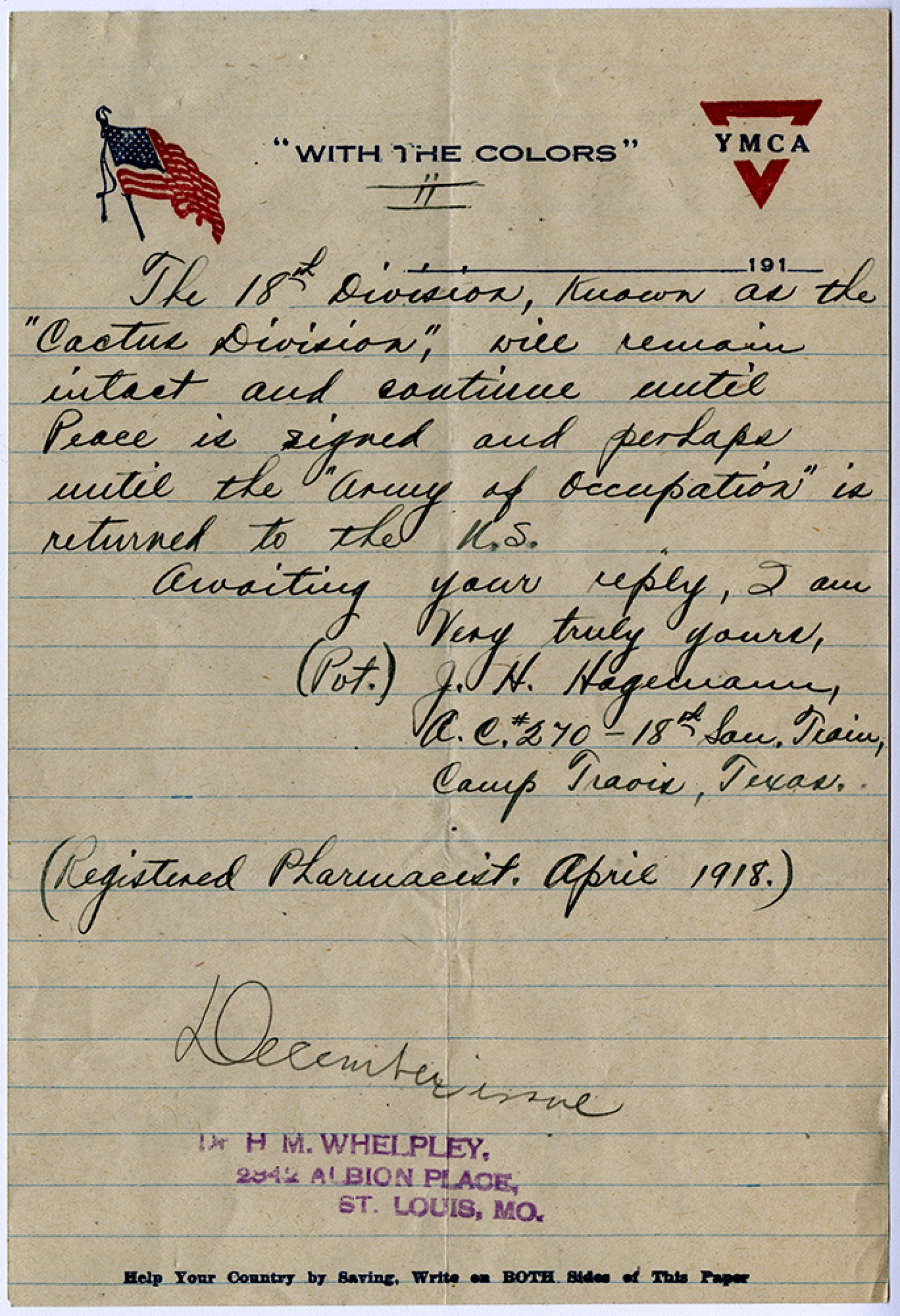 [page 2] The 18th Division, known as the “Cactus Division,” will remain intact and continue until Peace is signed and perhaps until the “Army of Occupation” is returned to the U.S. Awaiting your reply, I am Very truly yours, (Pvt.) J.H. Hagermann, A.C. #270 – 18th San. Train, Camp Travis, Texas. (Registered Pharmacist. April 1918.)