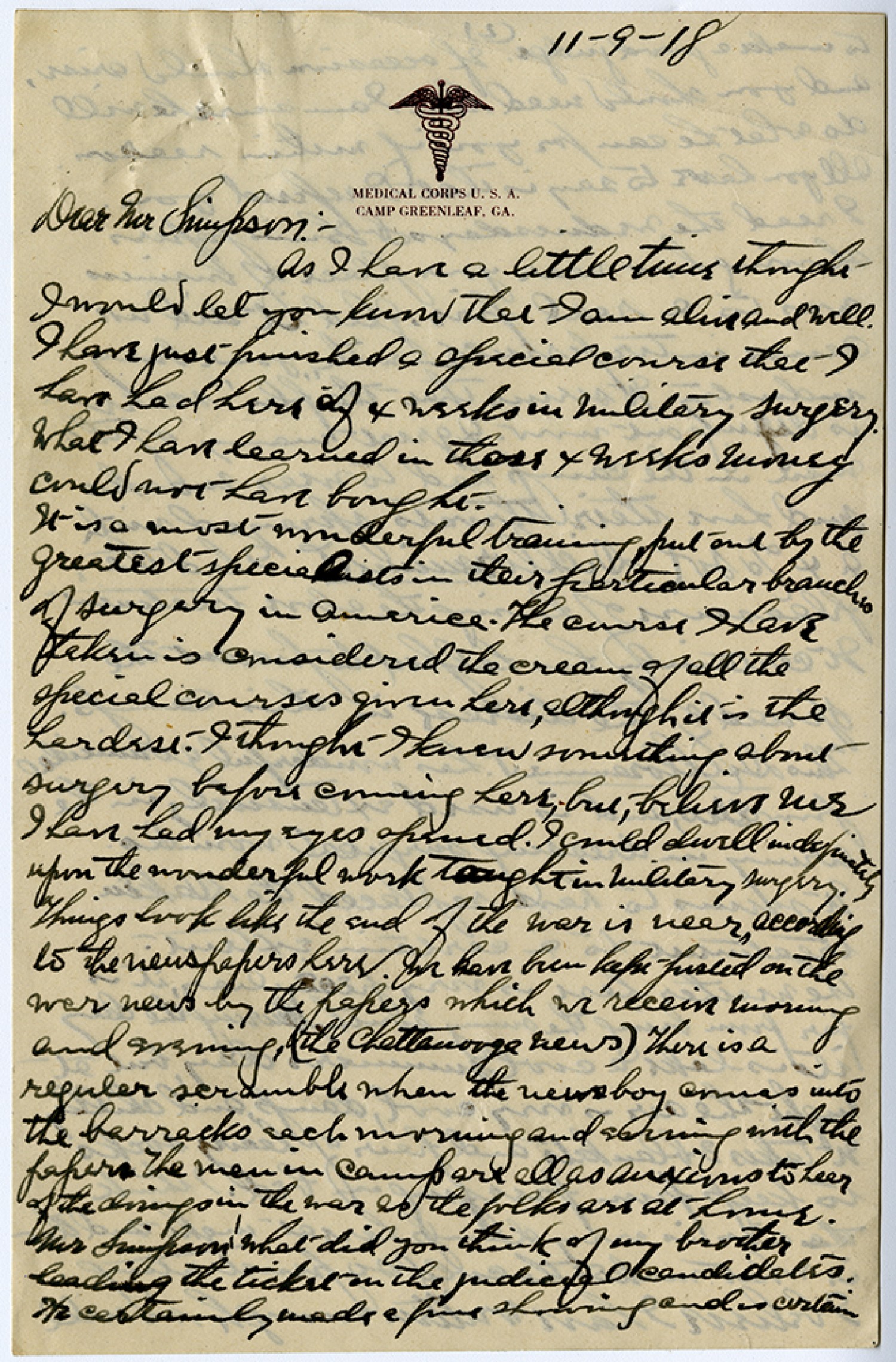 [November 9, 1918] Dear Mr. Simpson:- As I have a little time thought I would let you know that I am alive and well. I have just finished a special course that I have had here of 4 weeks in military surgery. What I have learned in those 4 weeks money could not have bought. It is a most wonderful training put on by the greatest specialist in their particular branches of surgery in America. The course I have taken is considered the cream of all the special courses given here, although it is the hardest. I thought I knew something about surgery before coming here, but, believe me I have had my eyes opened. I could dwell indefinitely upon the wonderful work taught in military surgery. Things look like the end of the war is neer, according to the newspapers here. We have been kept justed on the war news by the papers which we receive morning and evening, (the Chattanooga news) There is a regular scramble when the newsboy comes into the barracks each morning and evening with the papers The men in camp are all as anxious to heer of the [ms illegible: 1 wd] in the war as the folks are at home. Mr. Simpson what did you think of my brother leading the ticket on the judicial candidates. He certainly made a fine showing and is certain