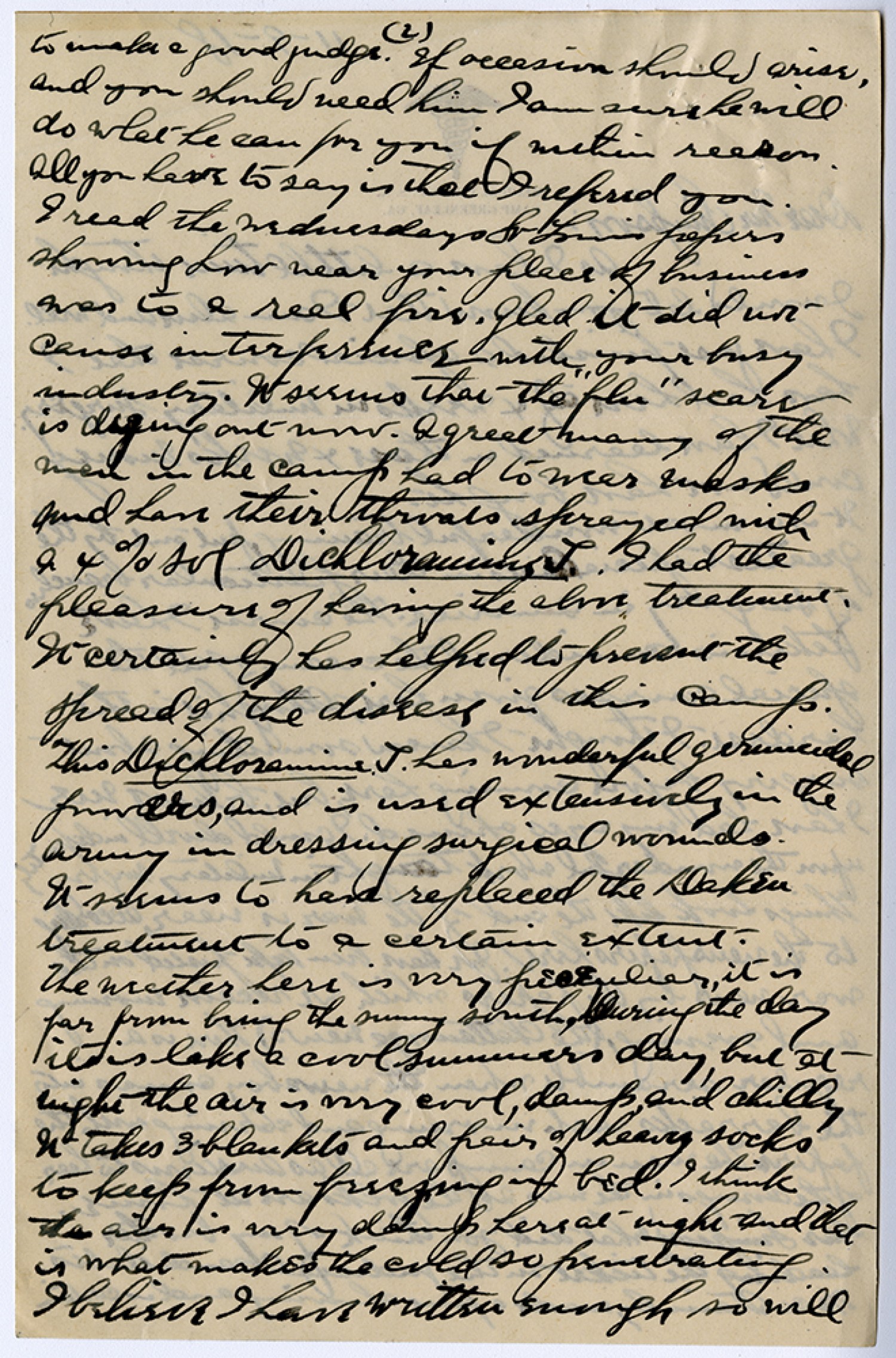 [page 2] to make a fine judge. If occasion should arise, and you should need him I am sure he will do what he can for you if within reason. All you have to say is that I refered you. I read the Wednesdays St. Louis papers showing how near your place of business was to a real fire. glad it did not cause interferrence with your busy industry. It seems that the “flu” scare is dying out now. A great many of the men in the camp had to wear masks and have their throats sprayed with a 4% sol Dichlorauine T. I had the pleasure of having the alive treatment. It certainly has helped to prevent the spread of the disease in this camp. This Dichlorauine T. has wonderful germicidal powers, and is used extensively in the Army in dressing surgical wounds. It seems to have replaced the Deken treatment to a certain extent. The weather here is very peculiar, it is far from being the sunny south. During the day it is like a cool summers day, but at night the air is very cool, damp and chilly it takes 3 blankets and pair of heavy socks to keep from freezing in bed. I think the air is very damp here at night and that is what makes the cold so penetrating. I believe I have written enough so will