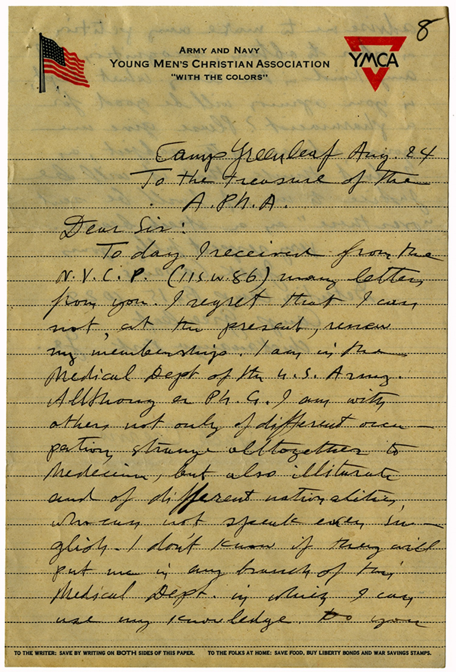Camp Greenleaf [August] 24 To the treasure of the A.PH.A. Dear Sir: Today I received from the N.V.C.P. (115 in 86) many letters from you. I regret that I can not, at the present, renew my membership. I am in the Medical Dept of the U.S. Army, Although a Ph.G. I am with others not only of different occupation, strange altogether to medicine, but also illiterate and of different nationality, who can not speak even english. I don’t know if they will put me in any branch of this Medical Dept. in which I can use my knowledge. Do you