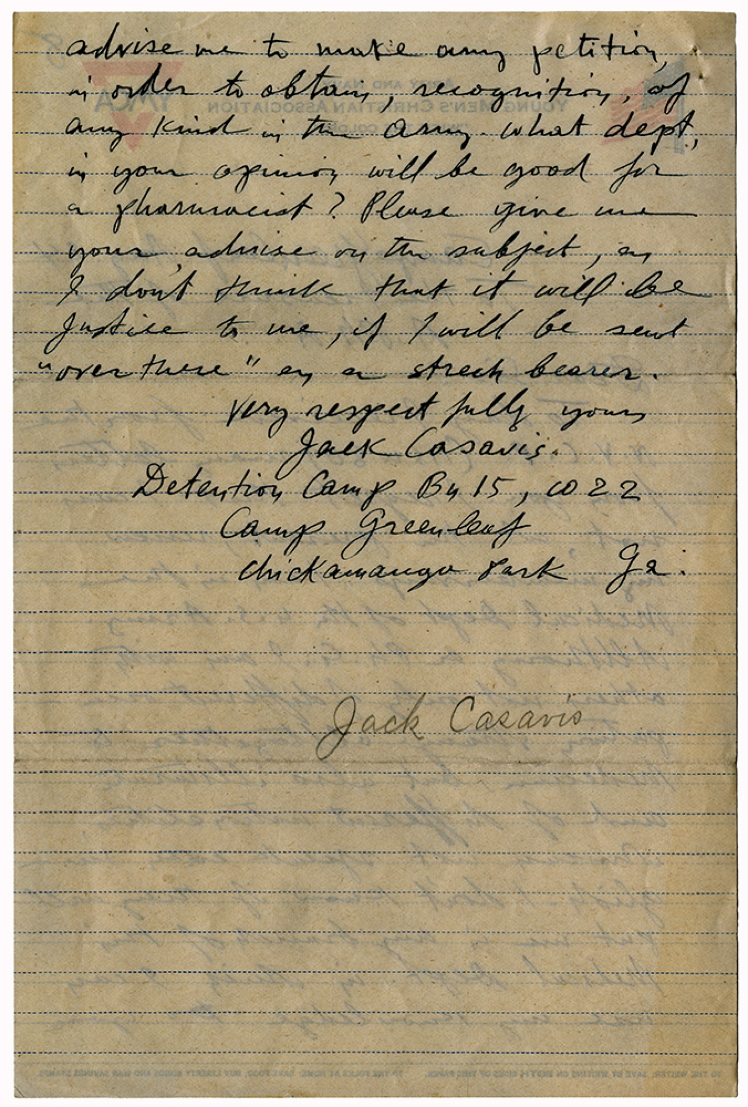 advise me to make any petition, in order to obtain recognition, of any kind in the Army. What dept, in your opinion will be good for a pharmacist? Please give me your advise on the subject, as I don’t think that it will be justice to me, if I will be sent “over there” as a stretch bearer. Very respectfully yours, Jack Casavis Detention Camp Bn 15, Co 22 Camp greenleaf Chickamanga Park [Georgia] Jack Casavis