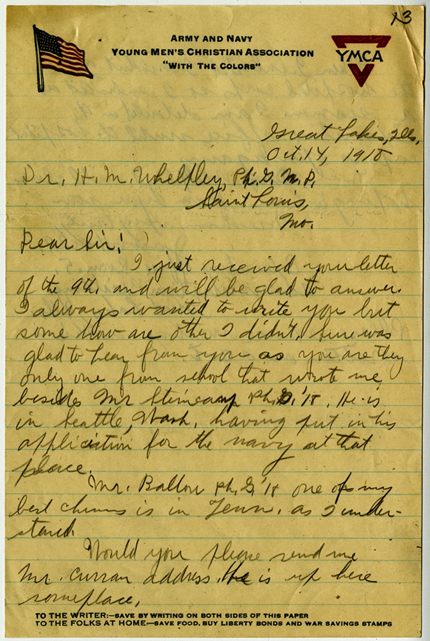 Great Lakes, [Illinois] [October] 14, 1918 Dr. [Henry Milton] Whelpley, Ph.G. M.D. [St. Louis], [Missouri] Dear Sir: I just received your letter of the 9th and will be glad to answer. I always wanted to write you but some how ore other I didn’t. Sure was glad to hear from you as you are the only one from school that wrote me besides Mr Steincamp Ph.G. [1918]. He is in Seattle, [Washington] having put in his application for the Navy at that place. Mr. Ballou Ph.G. [1918] one of my best chums is in [Tennessee] as I understand. Would you please send me Mr. Curran address. He is up here someplace.