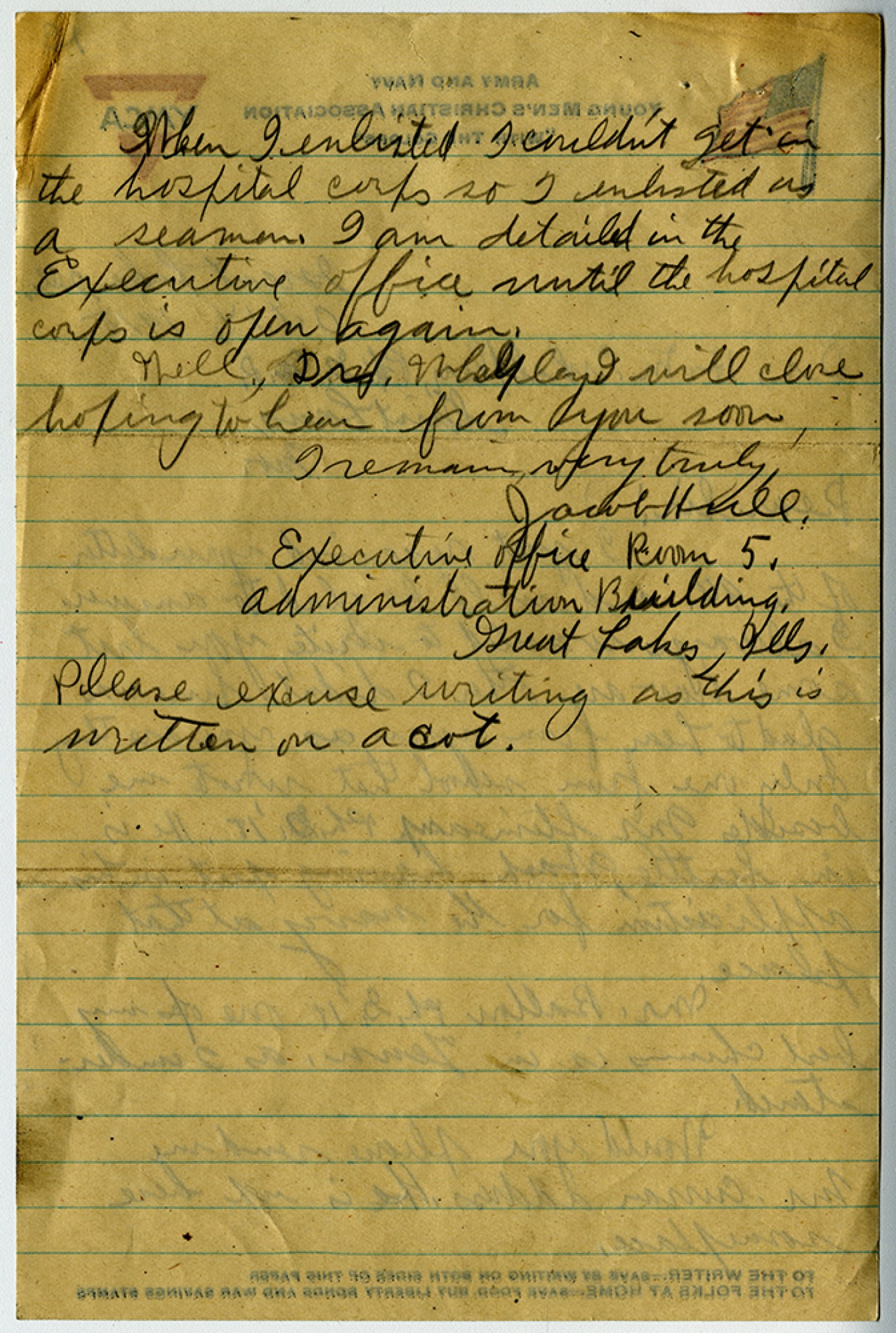 When I enlisted I couldn’t get in the hospital corps so I enlisted as a seaman. I am detailed in the Executive office until the hospital corps is open again. Well, Dr. Whelpley I will close hoping to hear from you soon, I remain very truly, Jacob Hull. Executive office Room 5. Administration Building. Great Lakes, [Illinois] Please excuse writing as this is written on a cot.