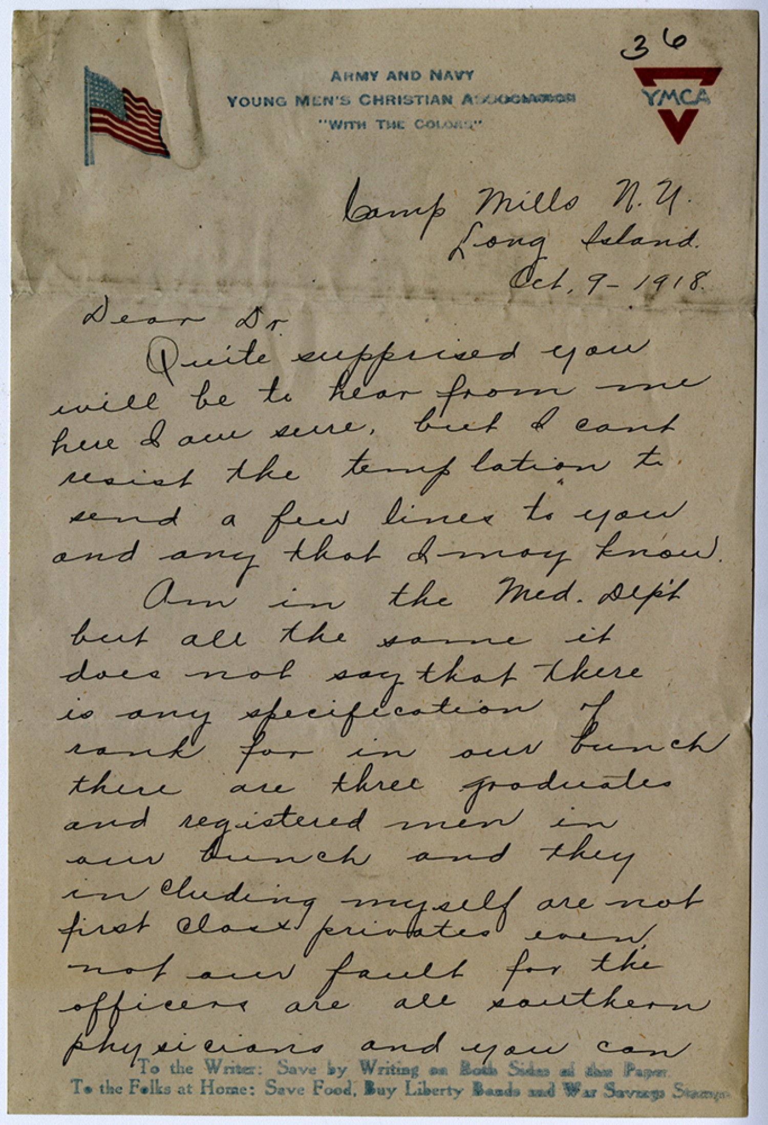 Camp Mills [New York] Long Island [October] 9 - 1918. Dear Dr. Quite surpprised you will be to hear from me here I am sure, but I cant resist the temptation to send a few lines to you and any that I may know. Am in the Med. Dept. but all the same it does not say that there is any specification of rank for in our bunch there are three graduates and registered men in our bunch and they including myself are not first class privates even not our fault for the officers are all southern physicians and you can