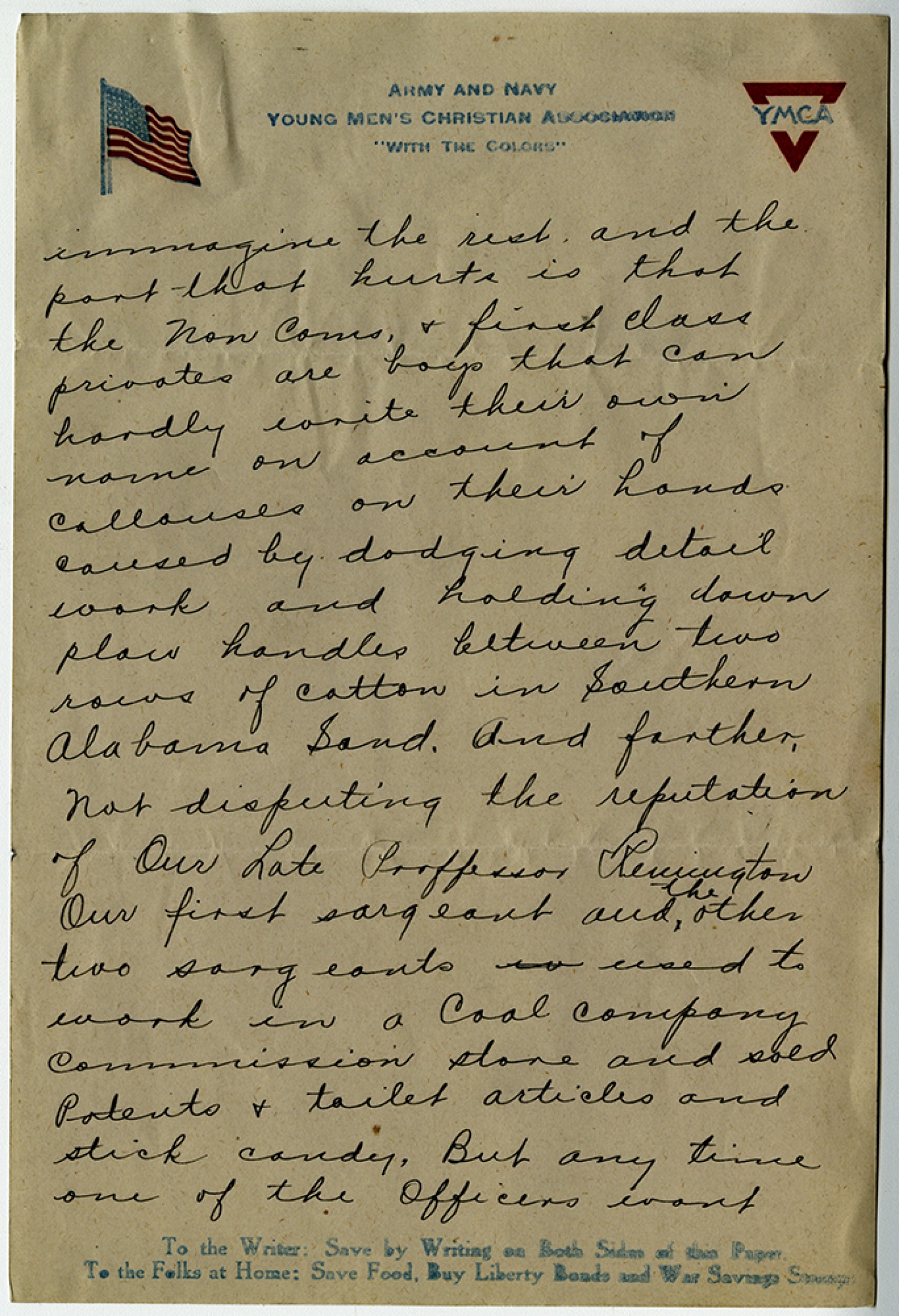 immagine the rest and the part that hurts is that the Non Coms, & first class privates are boys that can hardly write their own name on account of callouses on their hands caused by dodging detail work and holding down plow handles between two rows of cotton in Southern Alabama Sand. and farther, not disputing the reputation of Our Late Proffessor Remington Our first sargeant and the other two sargeants used to work in a Coal Company Commission store and sold patents & toilet articles and stick candy. But any time one of the Officers want