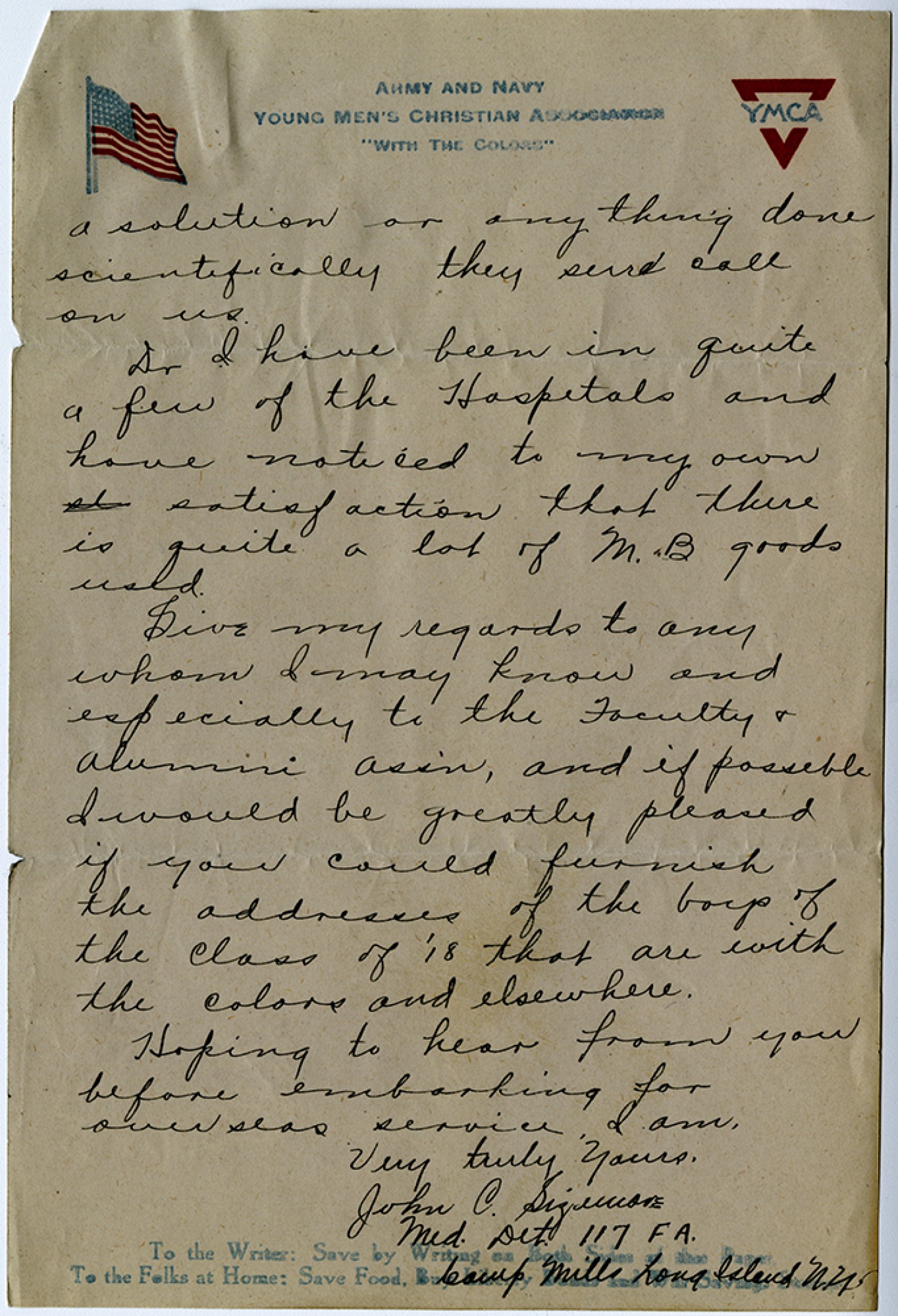 a solution or any thing done scientifically they sure call on us. Dr. I have been in quite a few of the Hospitals and have noticed to my own satisfaction that there is quite a lot of M.B. goods used. Give my regards to any whom I may know and especially to the Faculty & Alumni Assn, and if possible I would be greatly pleased if you could furnish the addresses of the boys of the Class of [1918] that are with the colors and elsewhere. Hoping to hear from you before embarking for over seas service. I am, Very truly yours, John C. Sizemore Med, Det. 117 F.A. Camp Mills Long Island [New York]