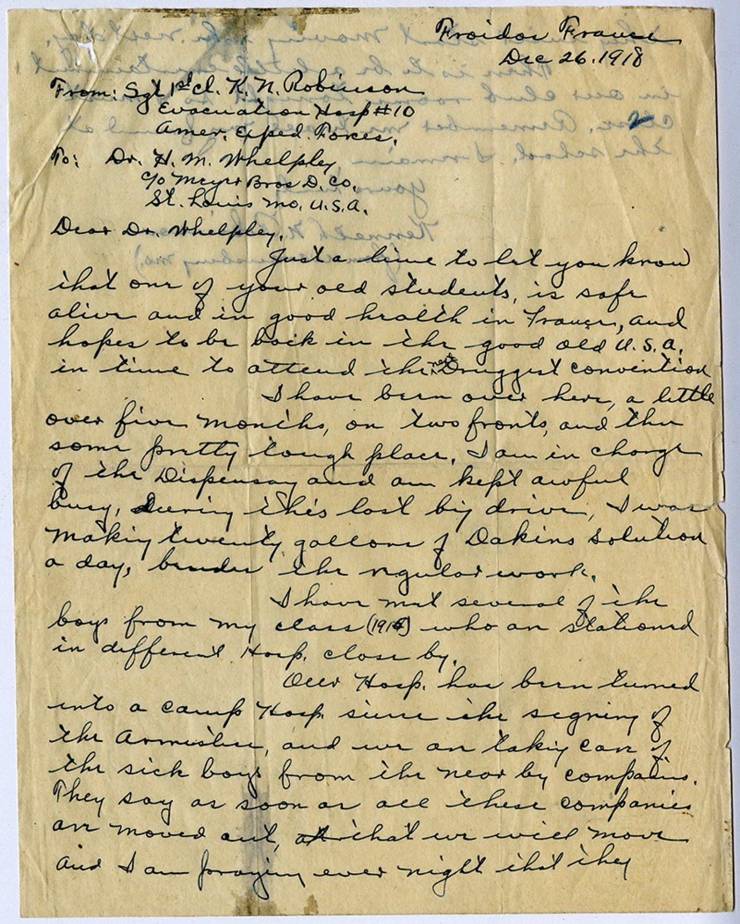 Froidor France [December] 26, 1918 From: Sgt 1st cl. K.N. Robinson Evacuation Hosp # 10 Amer. Exped. Forces. To: Dr. [Henry Milton] Whelpley c/o Meyer [Brothers Drug Company] St. Louis, [Missouri] U.S. A. Dear Dr. Whelpley, Just a line to let you know that one of your old students is safe alive in good health in France, and in hopes to be back in the good old U.S.A. in time to attend the next Druggist Convention I have been over here, a little over five months, on two fronts and then some pretty tough place. I am in charge of the Dispensary and am kept awful busy, during this last big drive, I was making twenty gallons of Dakins Solution a day, besides the regular work. I have met several of the boys from my class (1915) who are stationed in different Hosp. close by. Our Hosp. has been turned into a camp Hosp. since the signing of the Armistice, and we are taking care of the sick boys from the near by companies. They say as soon as all these companies are moved out, that we will move and I am praying every night that they