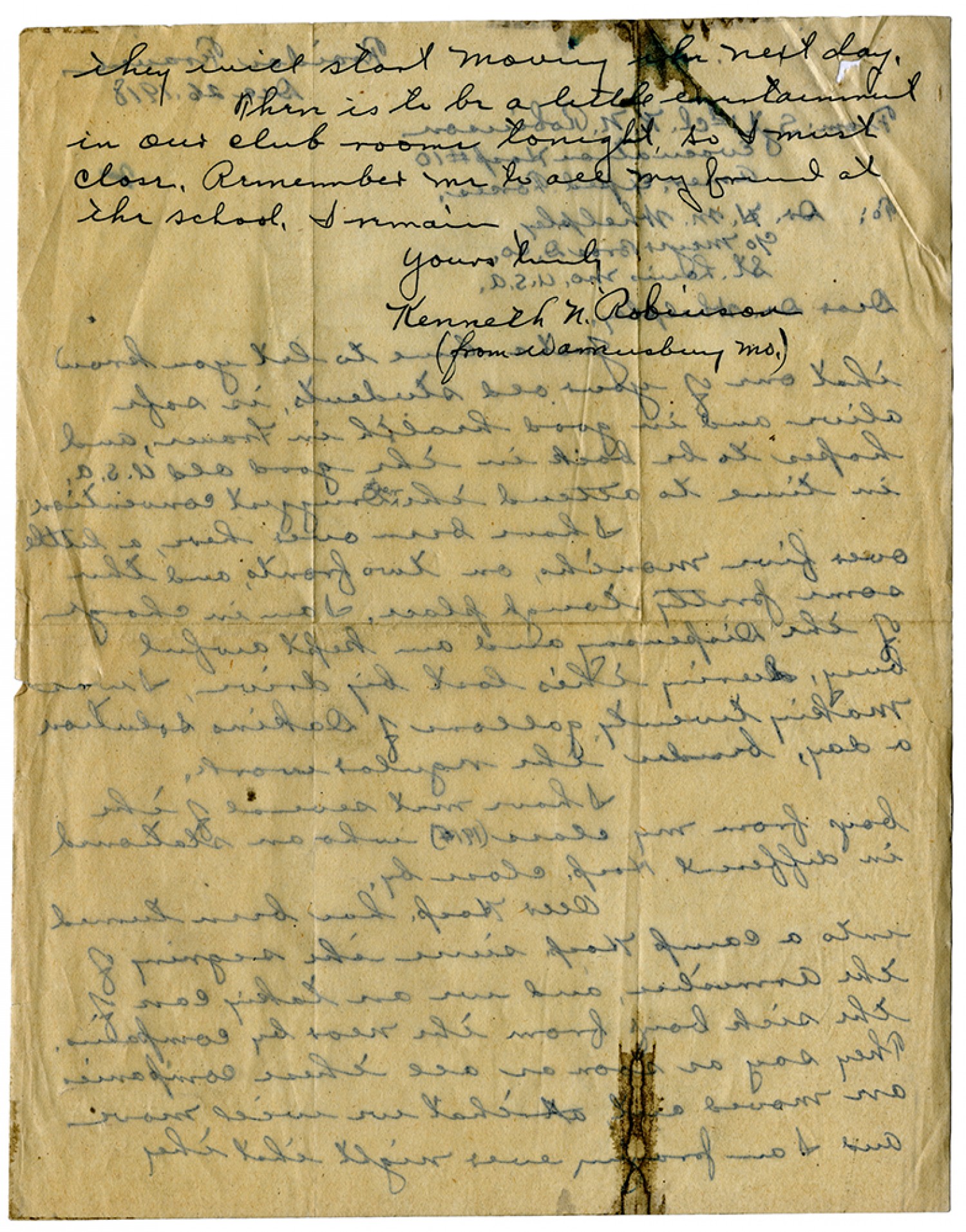 they will start moving the next day. There is to be a little entertainment in our club rooms tonight. So I must close. Remember me to all my friends at the school. I remain yours truly Kenneth N. Robinson (from Warrensburg [Missouri])